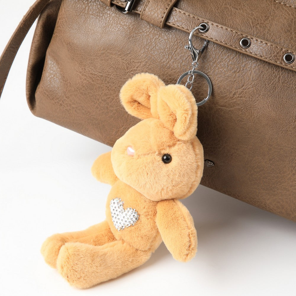 Llavero con diseño de conejo en tono café claro. Incluye un detalle decorativo en forma de corazón con strass en el frente y argolla metálica para colgar. Un accesorio decorativo, ideal para personalizar bolsos o llaves.