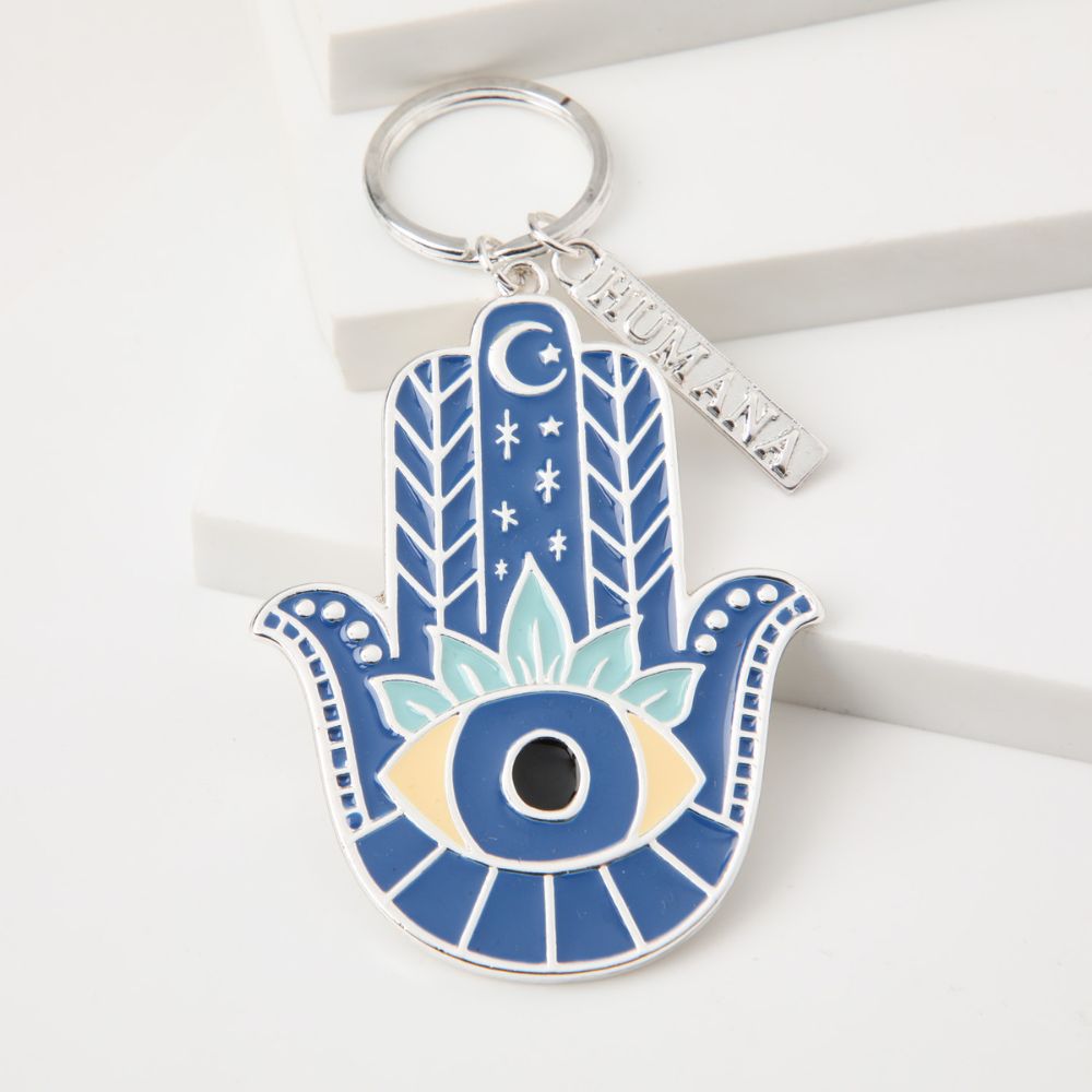 Llavero tipo mano de fátima (mano de dos pulgares y ojo en el medio) con colores azul, crema, negro y verde agua.