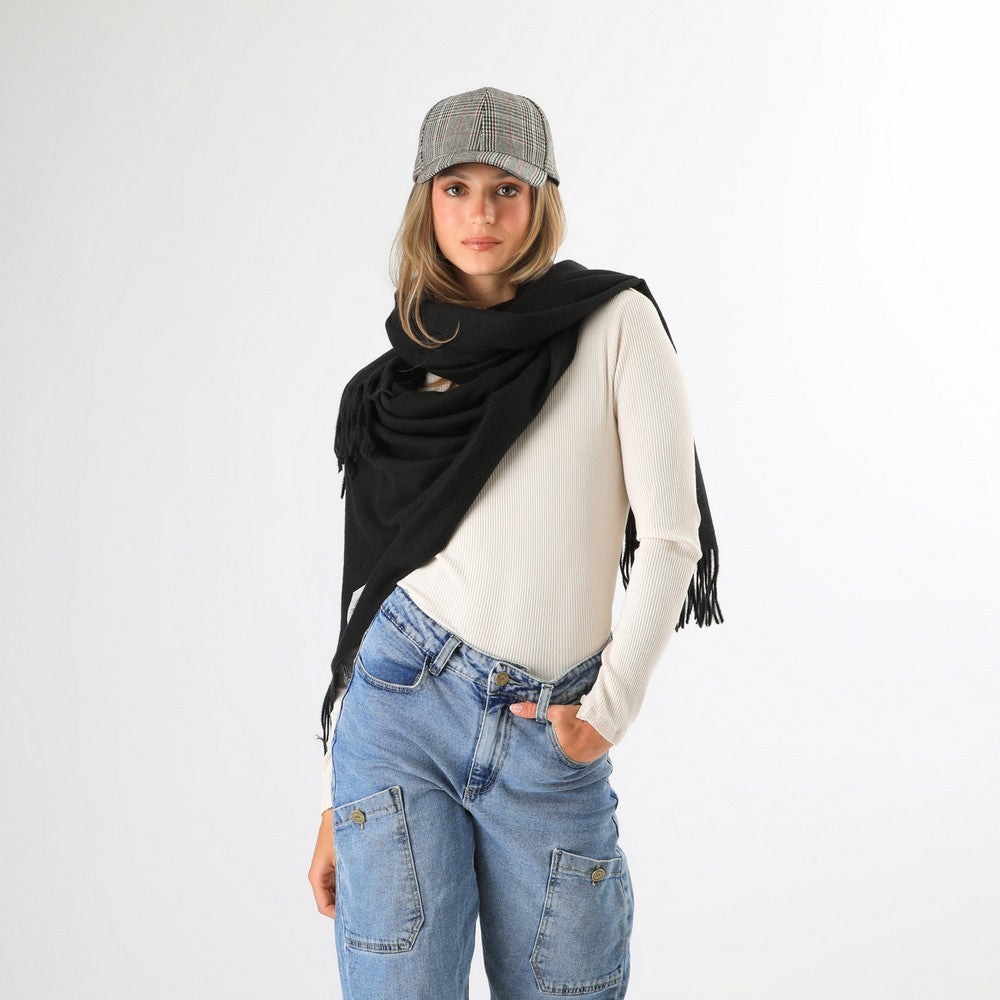Manta en tono negro, confeccionada en tejido suave y liviano. Presenta flecos largos en los bordes, que aportan movimiento. Su color neutro la hace fácil de combinar y versátil para distintos estilos. Un complemento cómodo y funcional para sumar abrigo de forma simple y elegante.