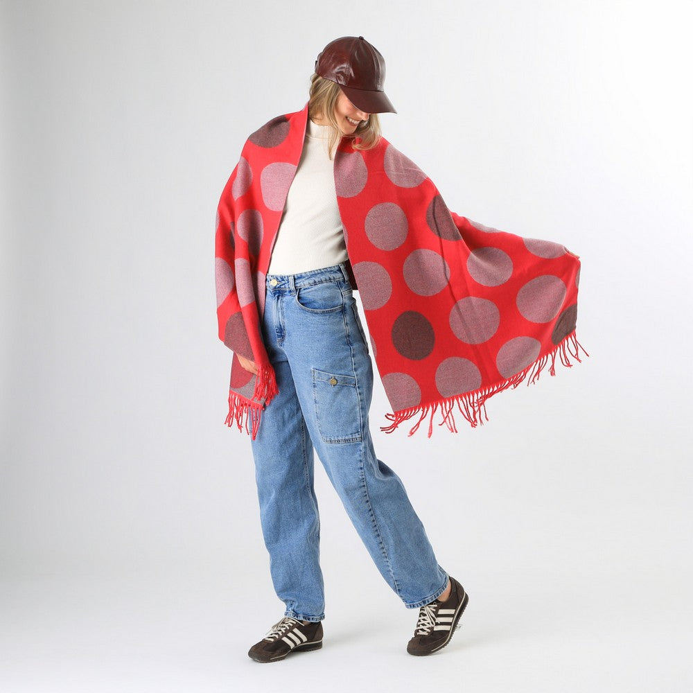 Manta tejida en lana en tono fuchsia, con diseño de círculos en contraste gris y terminación con flecos del mismo color. Incluye caída suave para usar al cuello y etiqueta textil con logo H en color blanco. De uso práctico para abrigar y aportar un toque de color al look. Un diseño moderno y funcional.