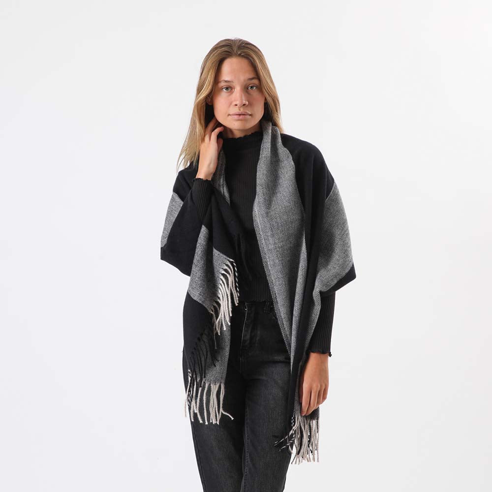 Manta tejida con diseño de franjas en blanco y negro y terminación de flecos en los mismos colores.