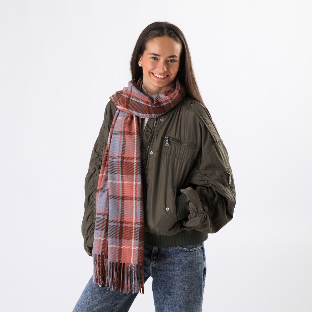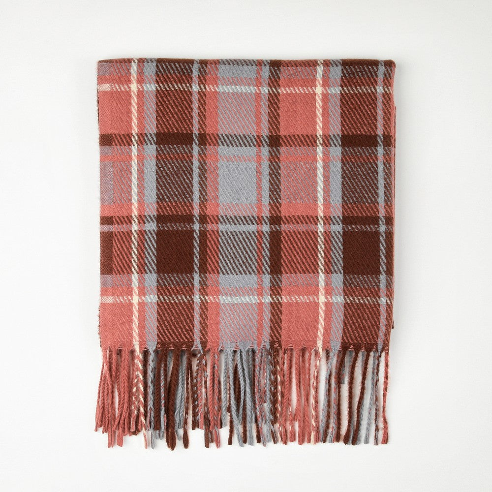 Manta tejida con diseño a cuadros, en una combinación de rosado, café y celeste, con líneas claras que aportan contraste. Presenta textura suave y terminaciones con flecos en los bordes, manteniendo un estilo clásico y fácil de combinar.