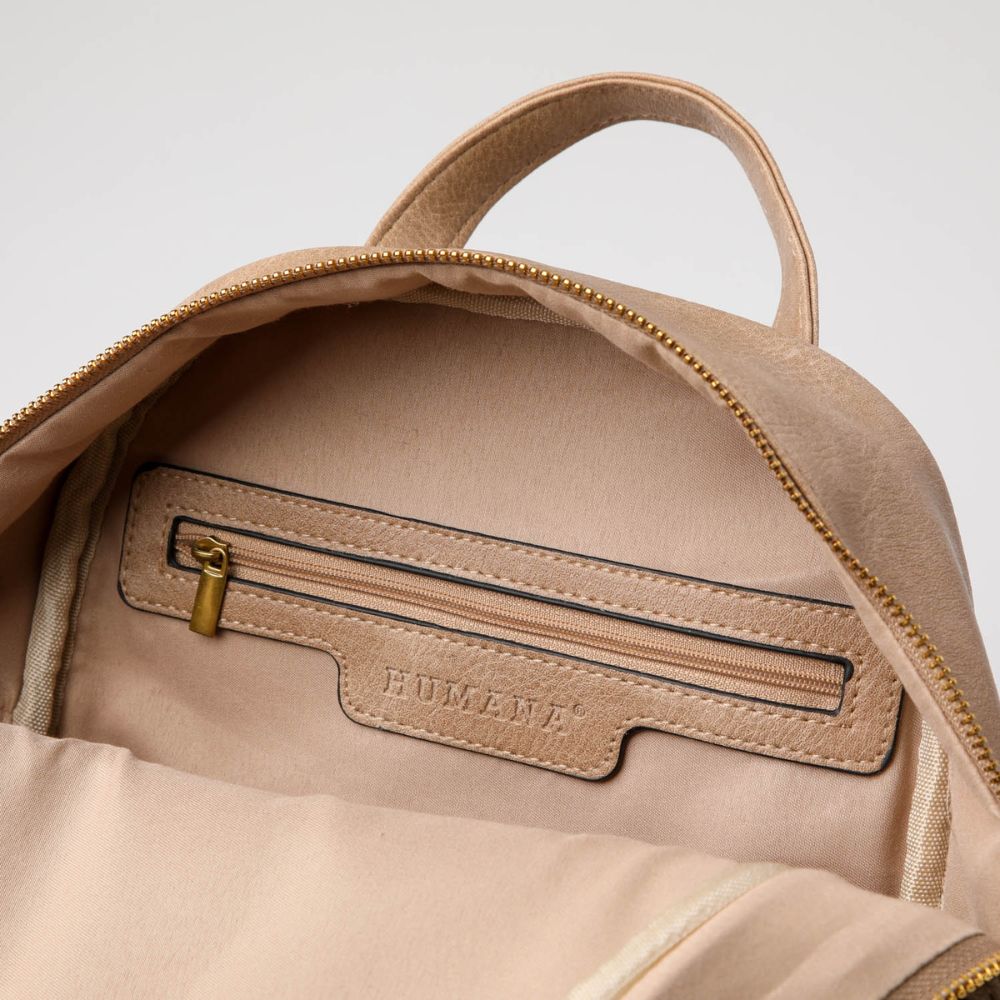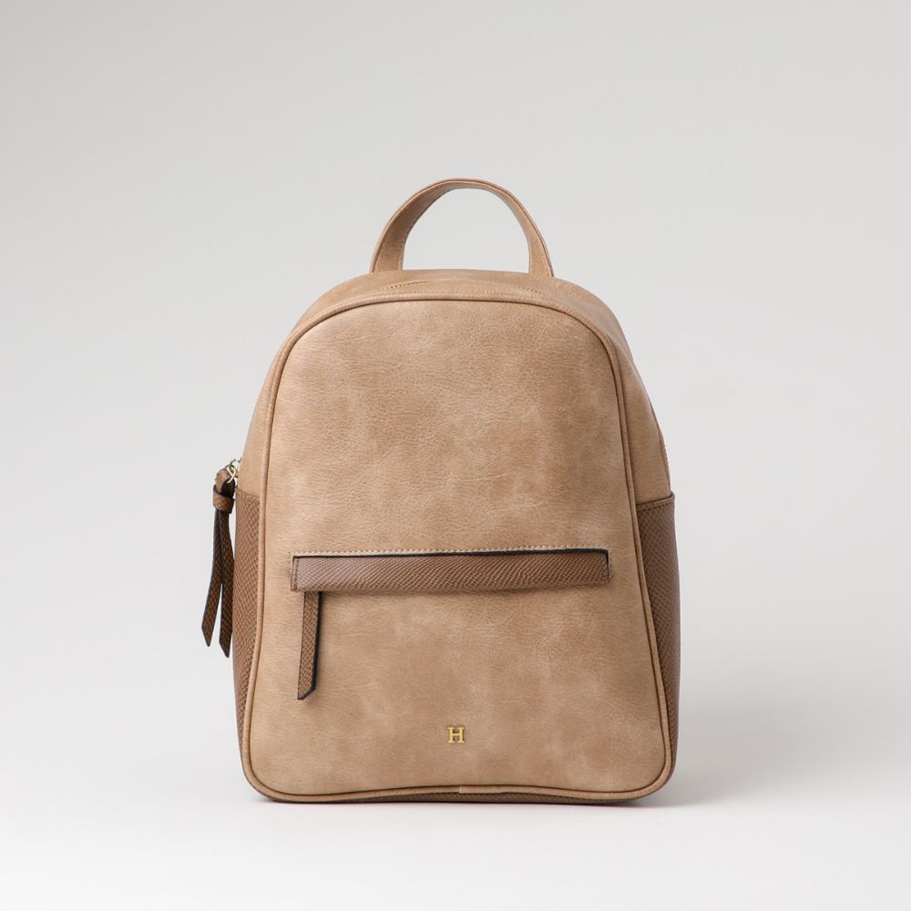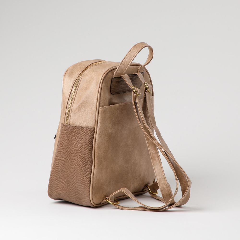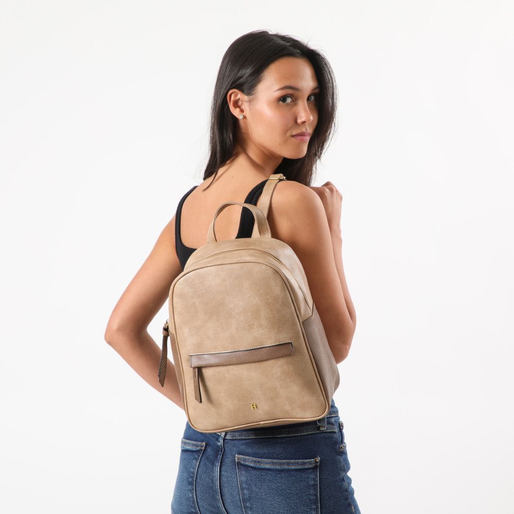 Mochila de ecocuero beige con correas ajustables y asa. Tiene cierre y en su interior hay 1 bolsillo con cierre y 2 abiertos. Por el frente tiene 1 bolsillo con cierre cubierto por una pequeña solapa. Los costados inferiores, la solapa y los cierres son de un ecocuero más oscuro y con textura. Los cierres, hebillas y logo son de metal dorado.