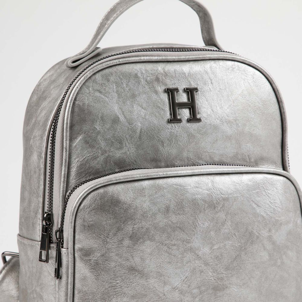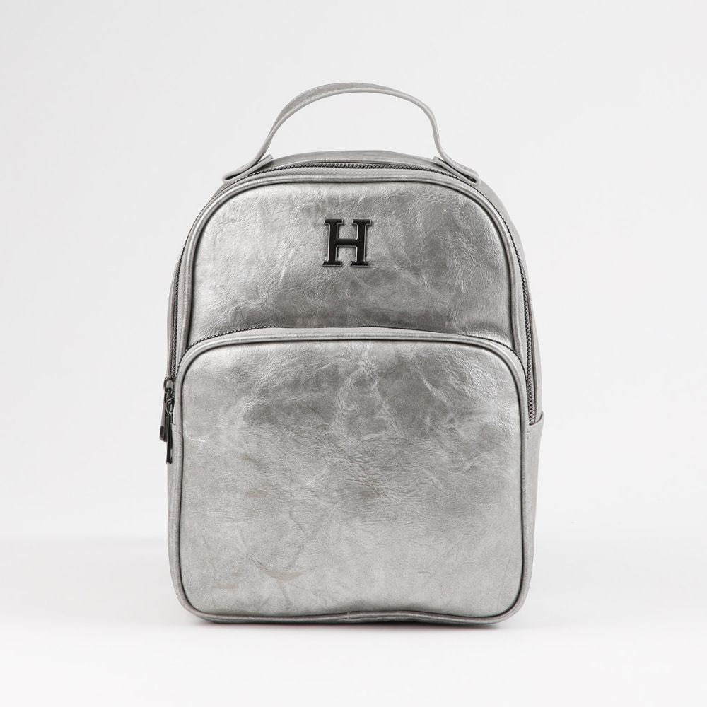 Mochila de ecocuero plateado con cierre, asa y correas ajustables. En su interior tiene un bolsillo con cierre y dos abiertos. En el frente tiene un bolsillo con cierre. En la base tiene un patrón de tachas que sirven como apoyo. El logo, tiradores y tachas son de metal plateado.