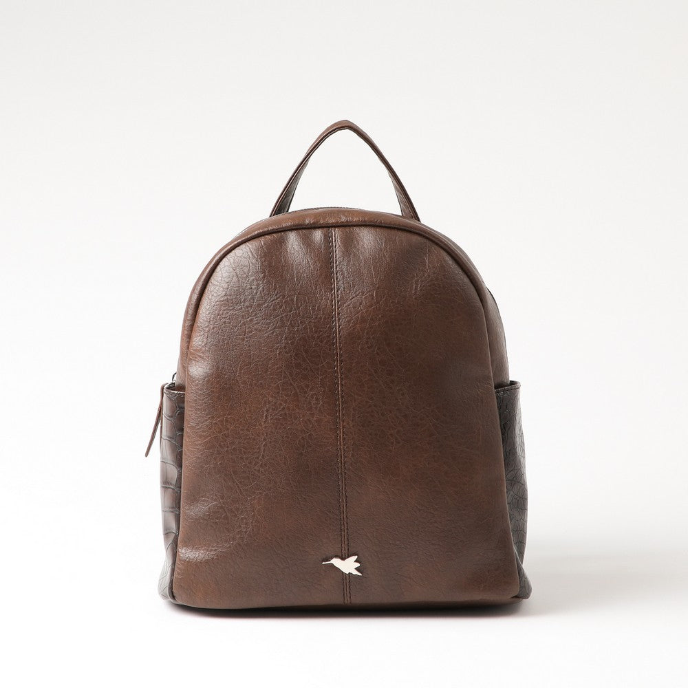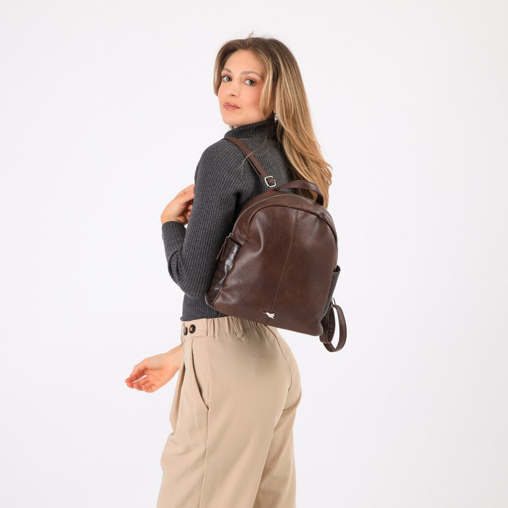 Mochila en ecocuero café, con textura suave y paneles laterales en acabado tipo cocodrilo. Incluye cierre superior metálico, bolsillos laterales, asa corta y tirantes ajustables. Interior con bolsillo con cierre y logo colibrí en metal plateado. De uso diario y práctico. Un diseño versátil y moderno.