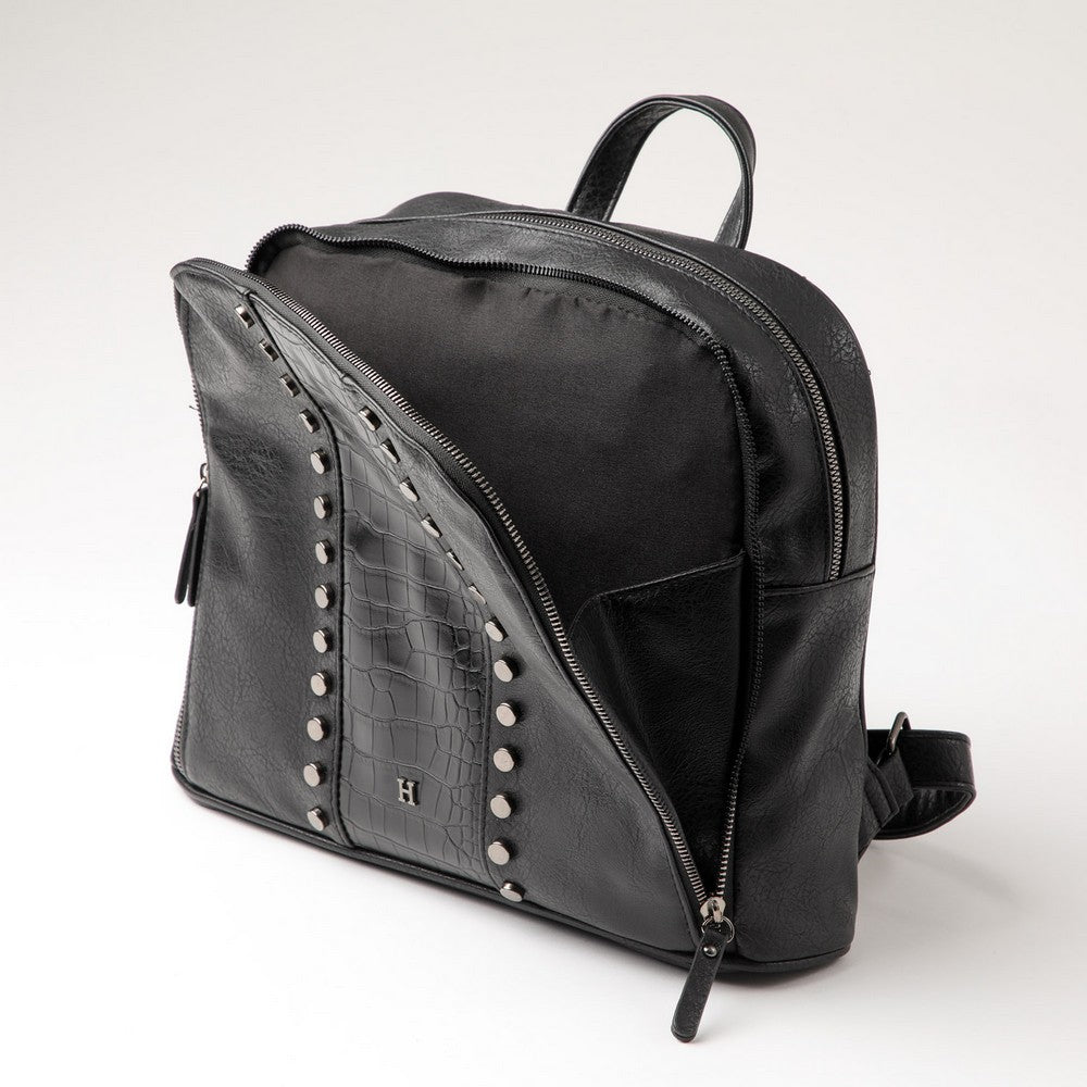 Mochila en ecocuero color negro, con panel frontal en textura tipo croco y aplicación de tachas metálicas. Incluye doble cierre superior, bolsillo frontal con cierre, compartimento interior con bolsillo con cierre y correas ajustables. Logo H en metal plateado al frente. De uso práctico para el día a día, ideal para llevar lo esencial con comodidad. Un diseño moderno y funcional.