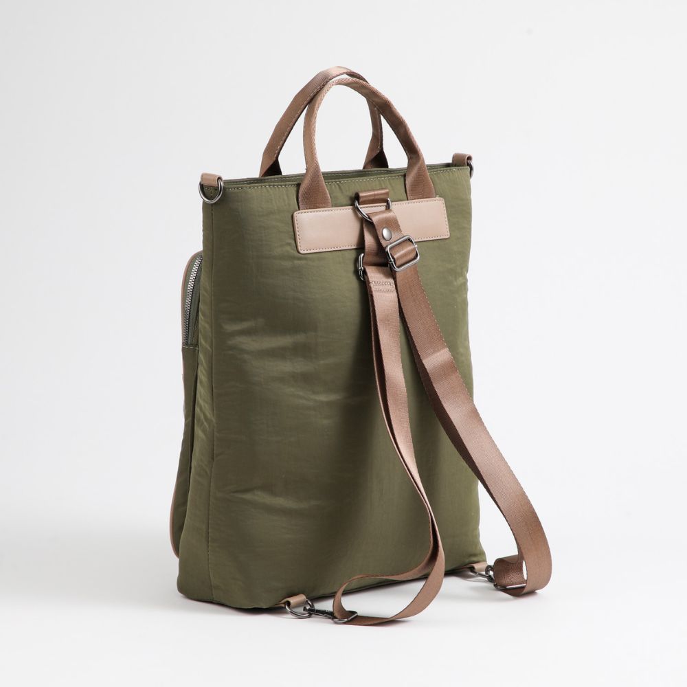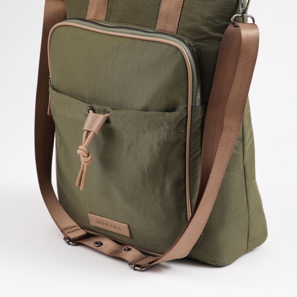 Mochila de nylon verde con cierre, dos asas y correas ajustables color bronce. En su interior tiene un compartimento para el computador y un bolsillo con cierre. En el frente tiene un compartimento con cierre que tiene dos bolsillos abiertos en su interior. También tiene un bolsillo en el frente exterior con cierre. Los cierres y tiradores son de metal plateado oscuro.