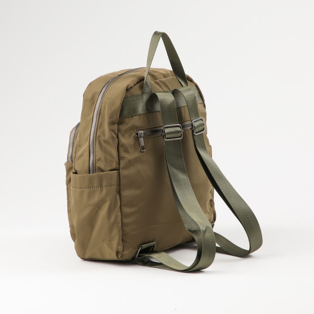 Mochila de nylon verde con cierre metálico. Al interior tiene un bolsillo con cierre y dos abiertos. En el exterior tiene dos bolsillos en los costados, dos bolsillos al frente con cierre y un bolsillo con cierre en la espalda. Las hebillas y cierre son de metal plateado oscuro y los tiradores son de ecocuero beige.