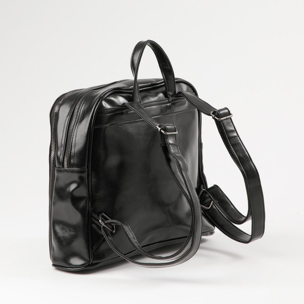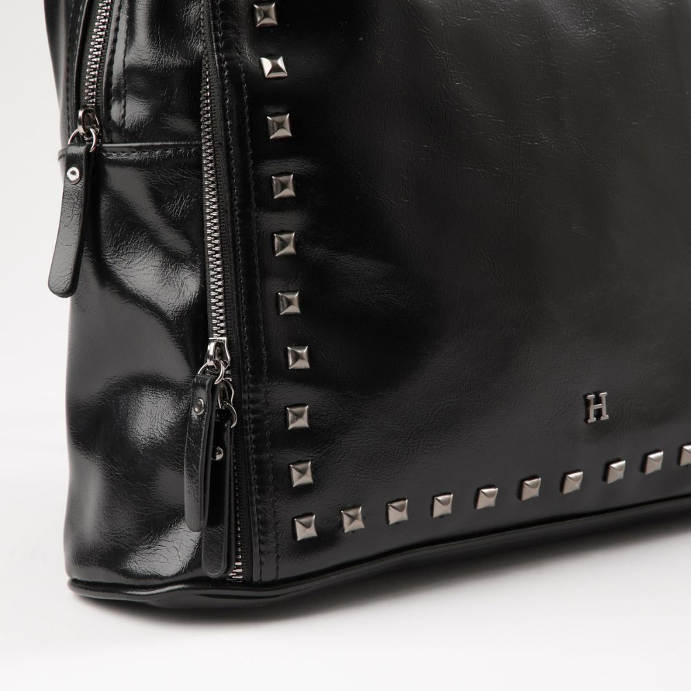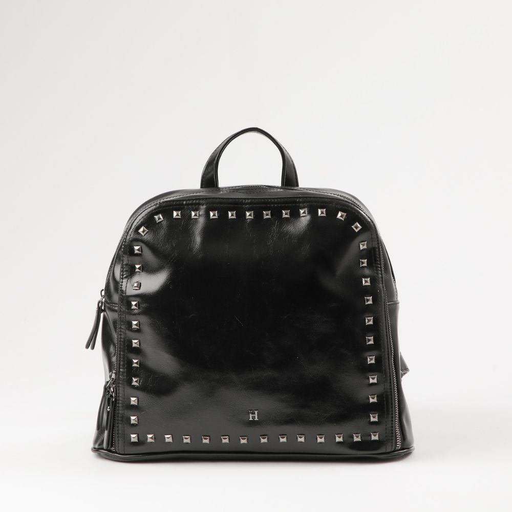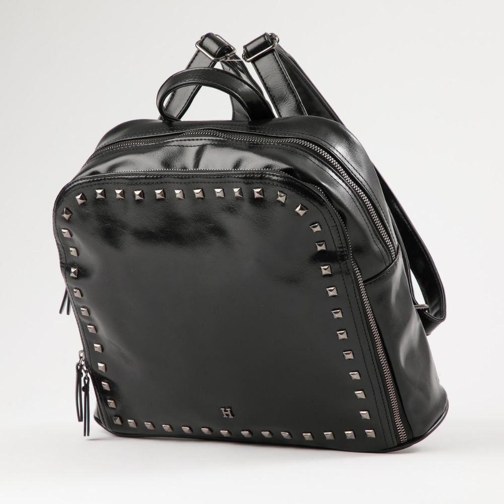 Mochila de ecocuero negro con cierre, correas ajustables y una asa. Al interior tiene un bolsillo con cierre y en el frente exterior tiene un gran bolsillo con tachas y con cierre, que también tiene dos bolsillos abiertos en su interior. Las tachas, tiradores, hebillas y logo son de metal plateado.