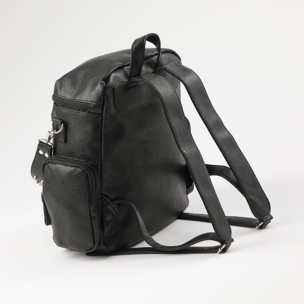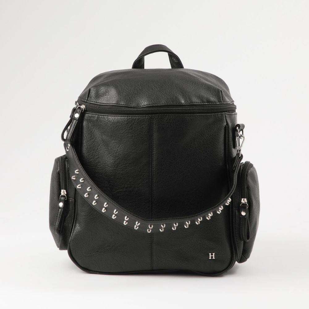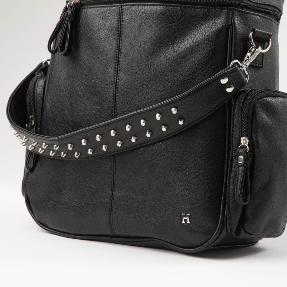 Mochila de ecocuero negro con cierre, correas ajustables y una asa. También tiene una correa con tachas removible, que permite llevarla al hombro. Al interior tiene un bolsillo con cierre y dos abiertos. En el exterior tiene dos bolsillos con cierre en los costados. Las tachas, tiradores, hebillas y logo son de metal plateado.