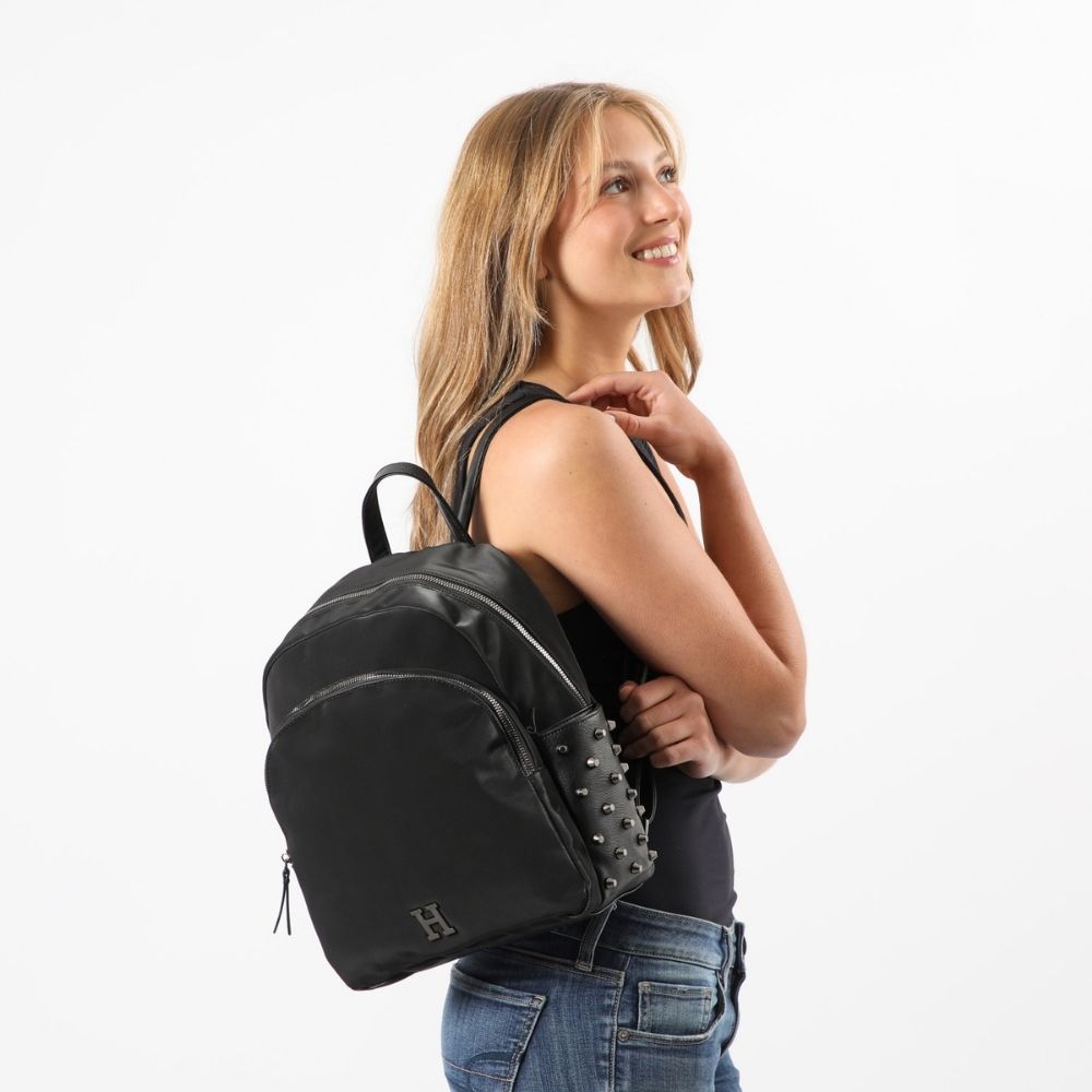 Mochila de nylon negro con cierre, asa y dos correas ajustables. Por el frente tiene un bolsillo con cierre, por los costados lleva dos bolsillos abiertos de ecocuero con tachas y en el interior tiene un bolsillo con cierre y dos abiertos. Las tachas, hebillas, cierres y logo son de metal plateado oscuro.