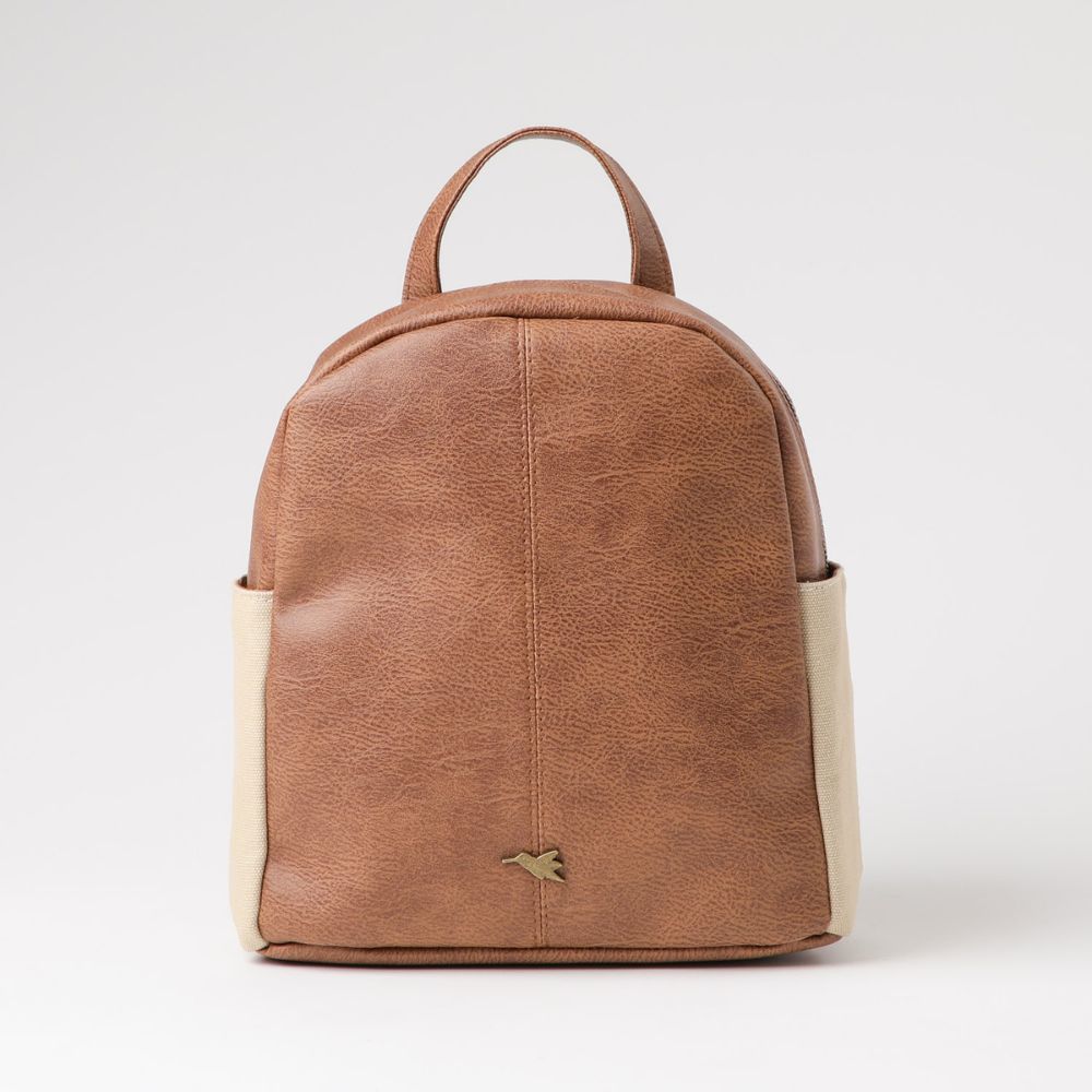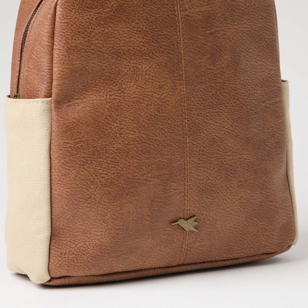 Mochila de ecocuero café con asa y correas ajustables. Tiene cierre y por los costados hay bolsillos de tela beige abiertos. En su interior hay 1 bolsillo con cierre y 2 abiertos. Los cierres, hebillas y logo son de metal doradoo oscuro.