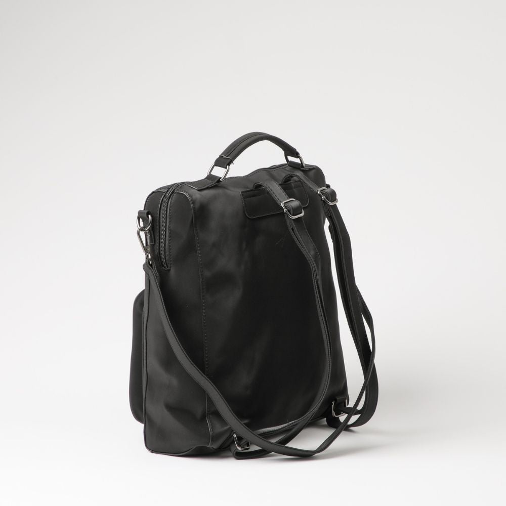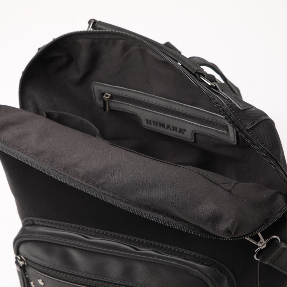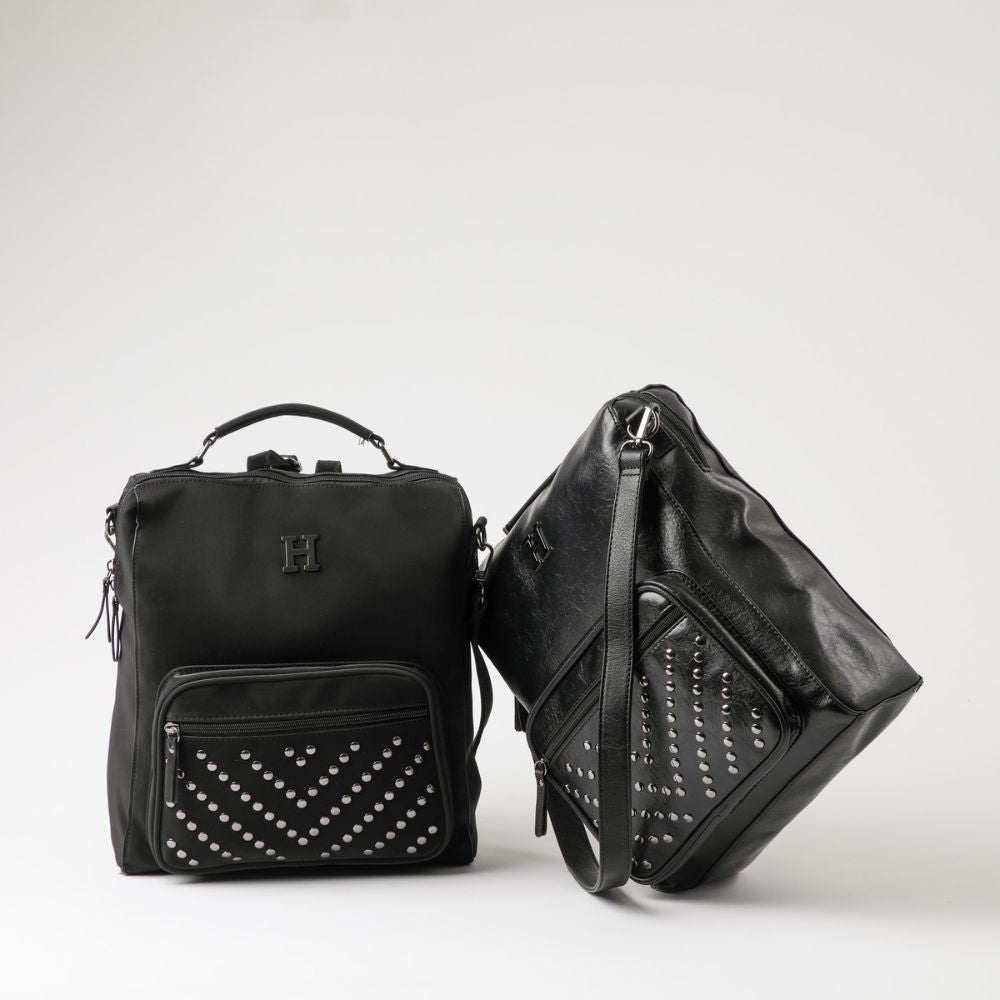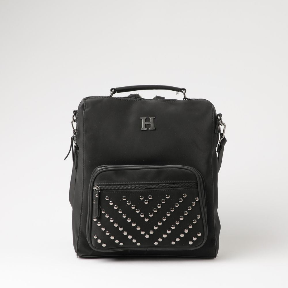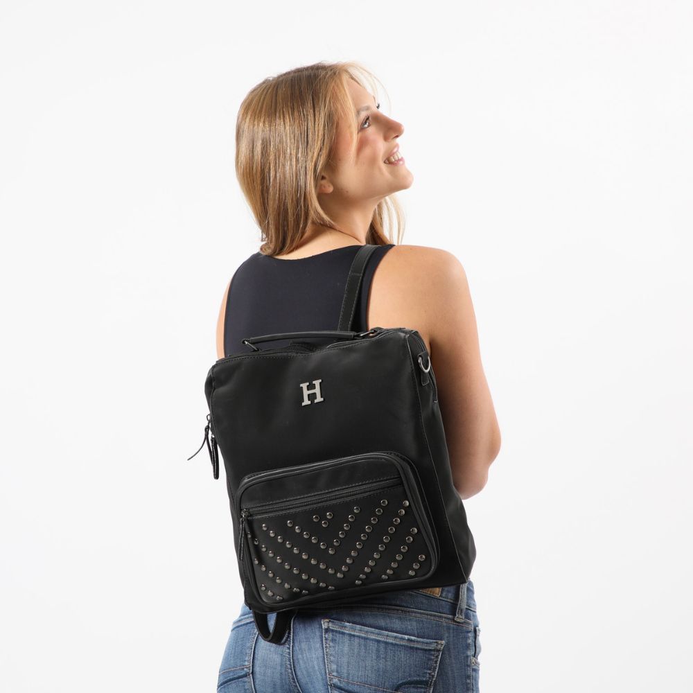 Mochila de nylon negro con cierre, asa y dos correas ajustables. Por el frente tiene un bolsillo con cierre y tachas. En el interior tiene un bolsillo con cierre y dos abiertos. Las tachas, hebillas, cierres y logo son de metal plateado oscuro.