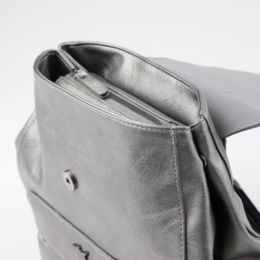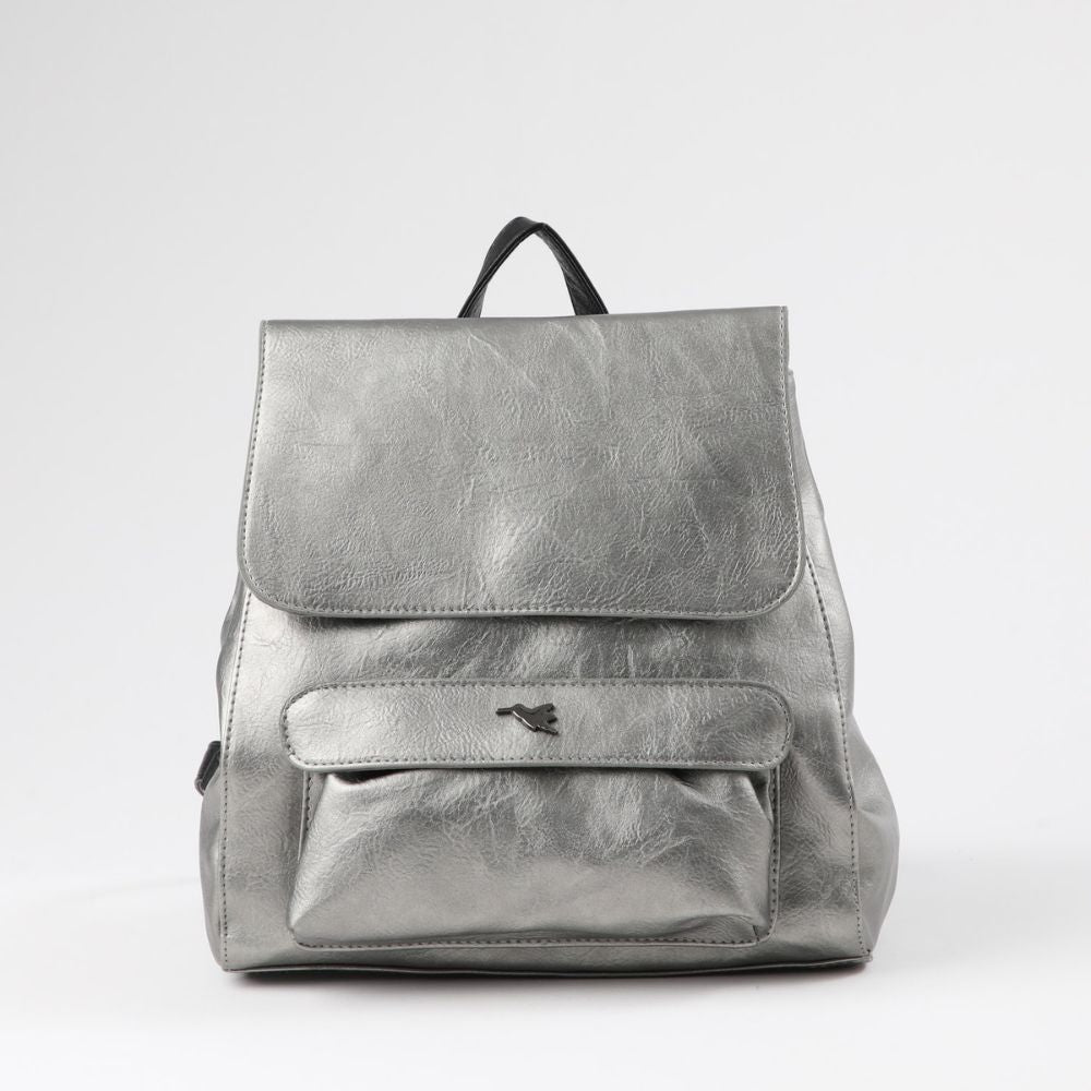 Mochila mediana ecocuero plateado y negro con tiras ajustables. Bolsillo externo y doble cierre.