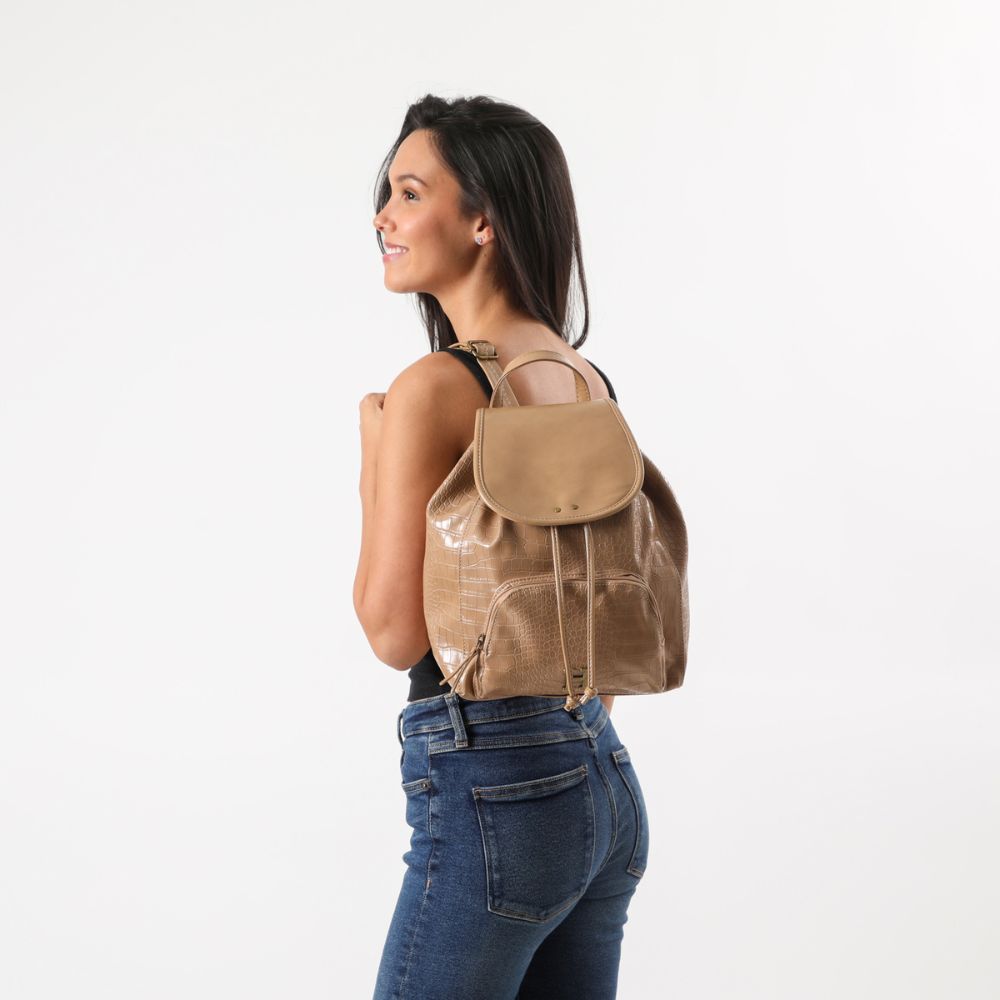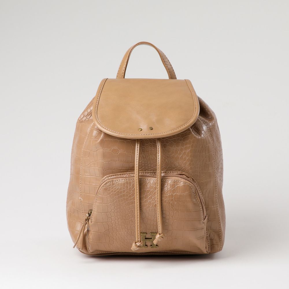 Mochila de ecocuero beige con textura croco con correas ajustables, asa, solapa y tiradores de ecocuero beige liso. En su exterior lleva 1 bolsillo en la parte inferior del frente y la apertura principal se cierra con tiras ajustables y se cubre con una solapa que se cierra con iman. En el interior tiene 1 bolsillo con cierre y 2 abiertos. Las hebillas, tiradores, iman y logo son de metal dorado oscuro.