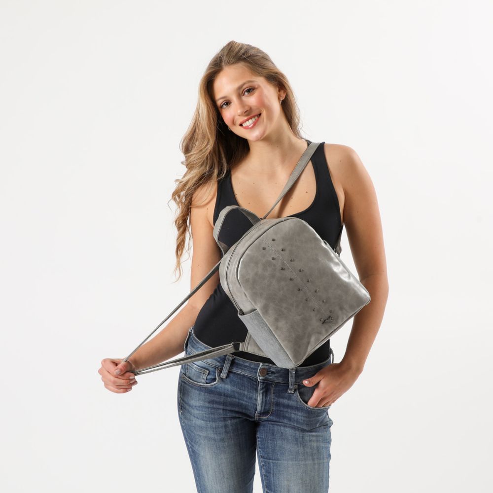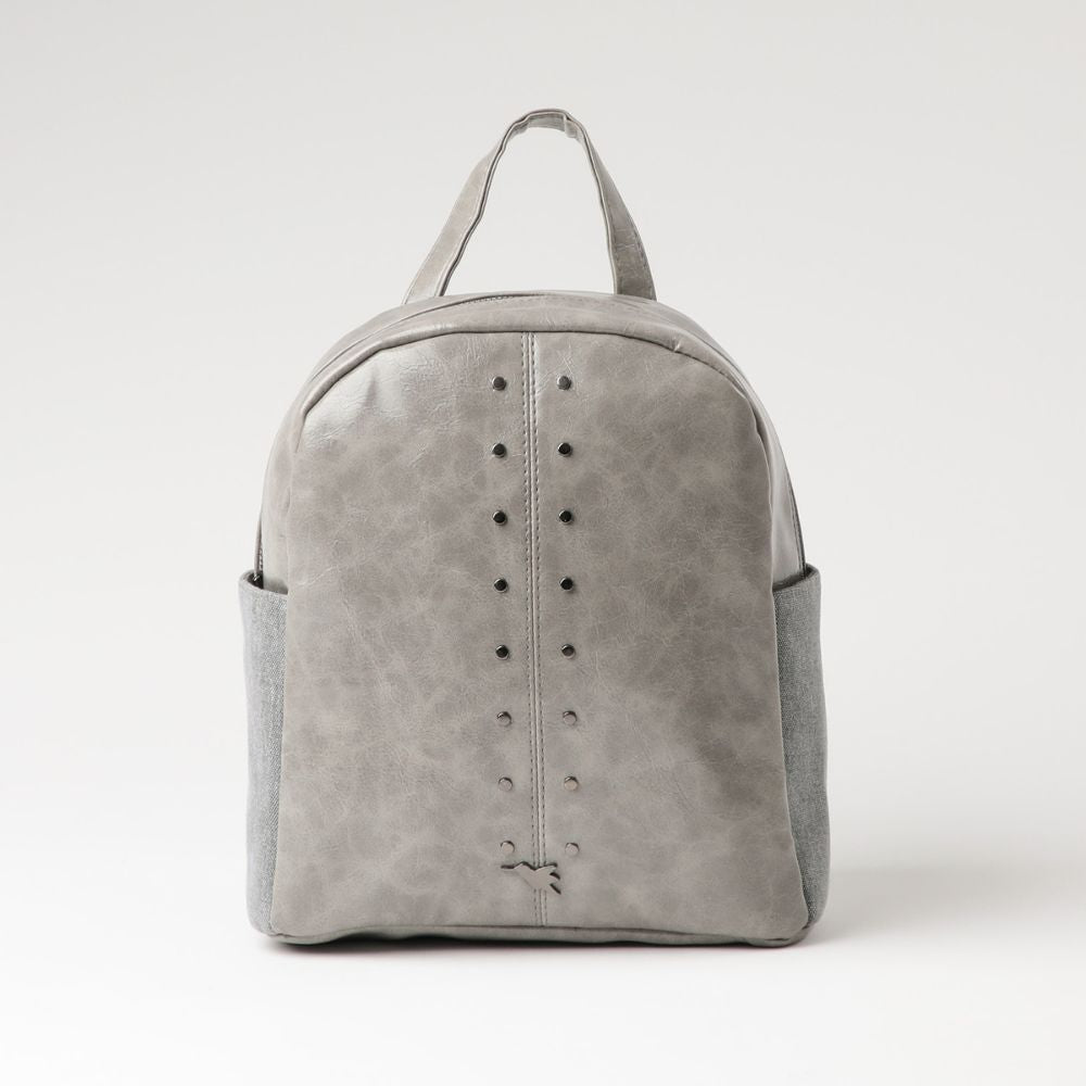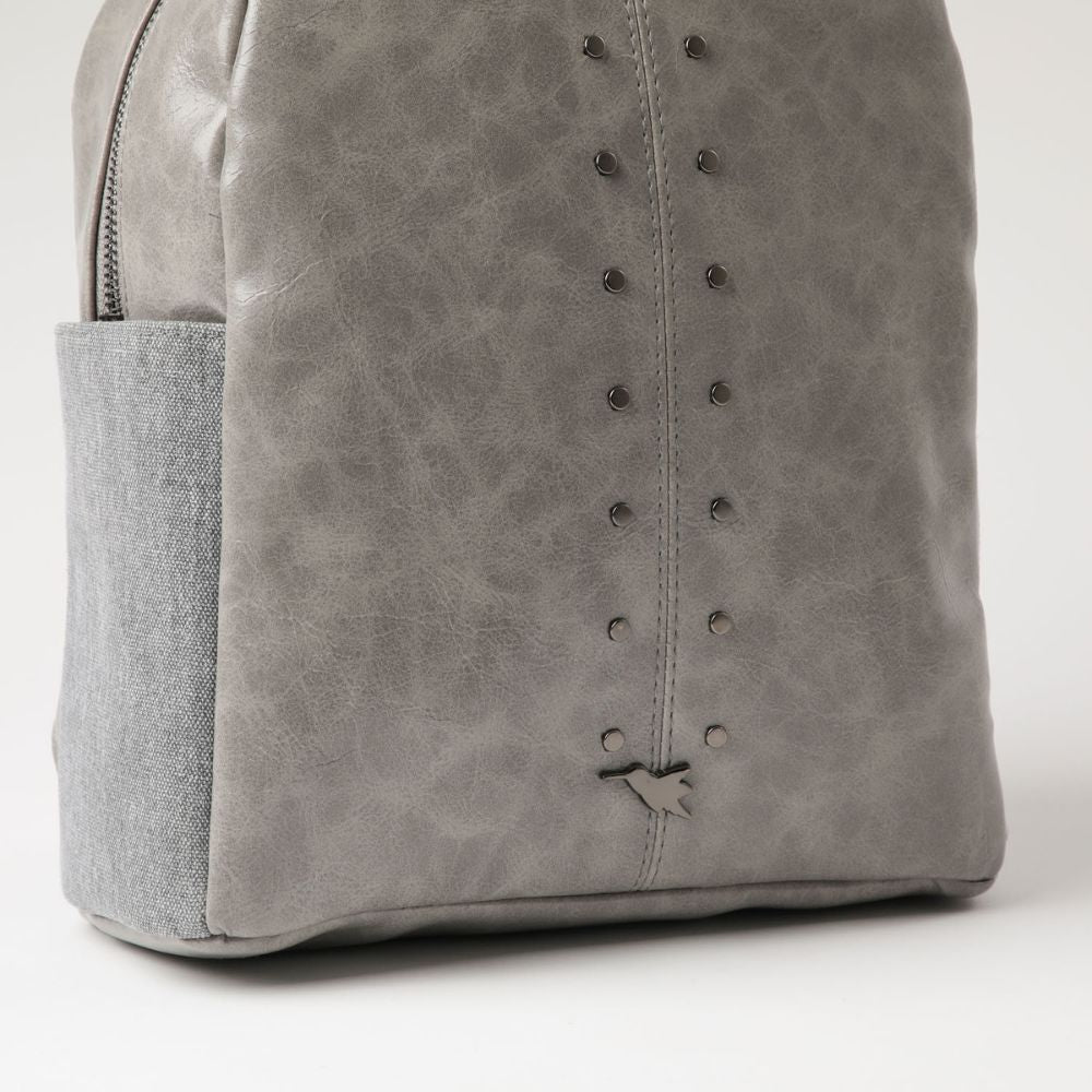 Mochila de ecocuero gris con asa y correas ajustables. Tiene cierre, por el medio del frente lleva un par de lineas verticales de tachas y en los costados del cuerpo hay bolsillos de tela abiertos. En su interior hay 1 bolsillo con cierre y 2 abiertos. Los cierres, hebillas y logo son de metal plateado oscuro.