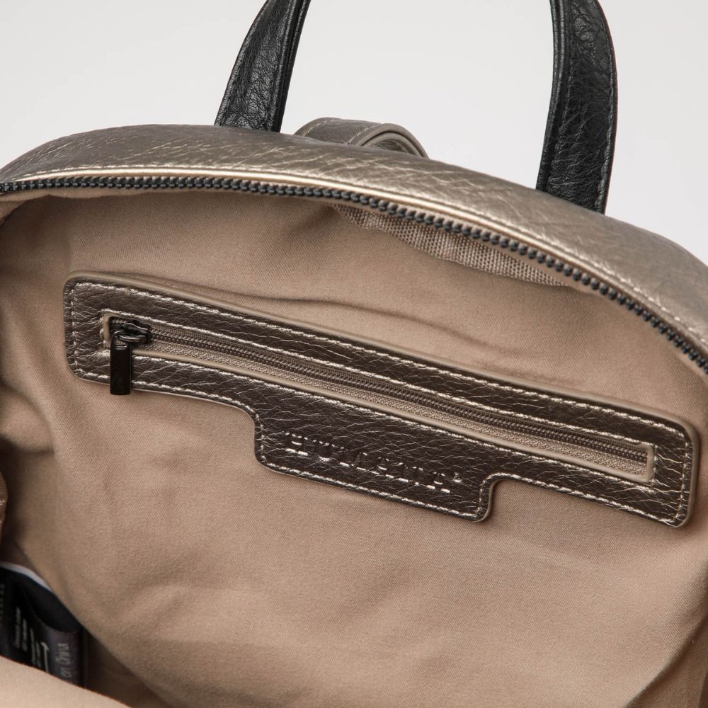 Mochila de ecocuero beige metálico con correas ajustables, y con asa, tiradores y logo en ecocuero negro. En su exterior lleva 3 bolsillos, dos a los costados y uno al frente, además del cierre principal. En el interior tiene 1 bolsillo con cierre y 2 abiertos. Los cierres son de metal plateado oscuro.