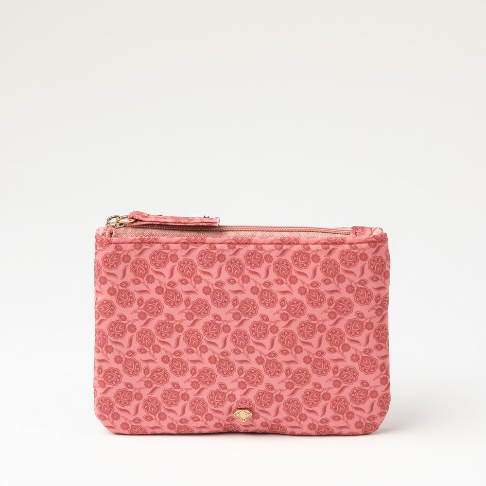 Monedero en nylon rosado con patrón floral rojo. Incluye cierre superior con tirador y logo diamante en metal plateado. Un diseño elegante y funcional.