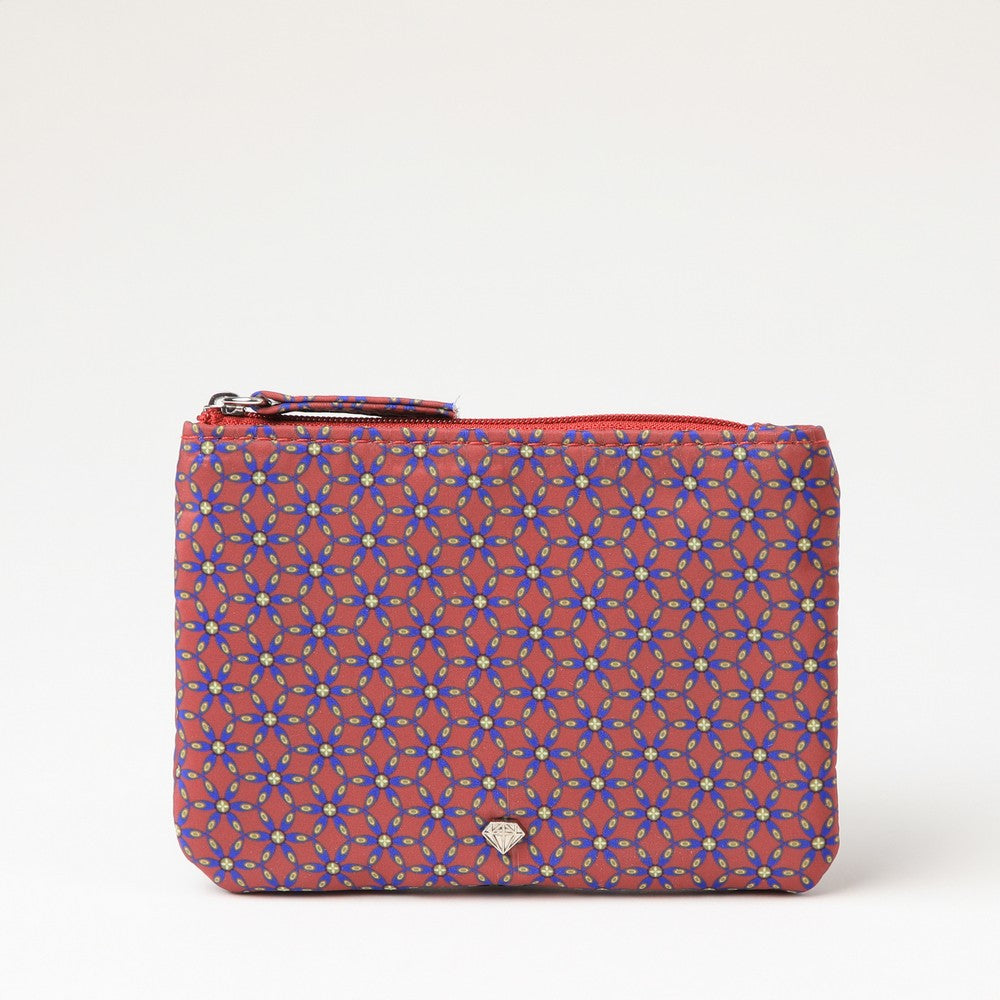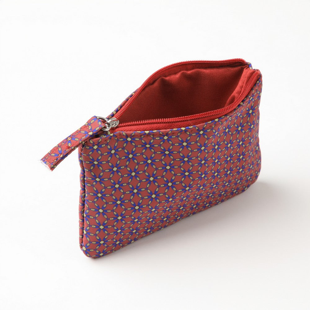 Monedero en nylon rojo con patrón de flores en color azul y un toque amarillo. Incluye cierre superior con tirador y logo diamante en metal plateado. Un diseño elegante y funcional.