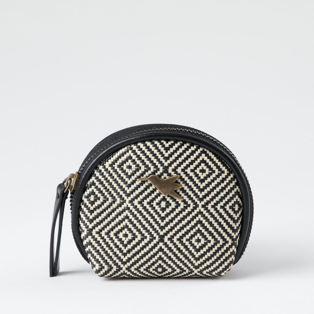 Monedero redondo duro de hebras negras y blancas tejidas en rombos.