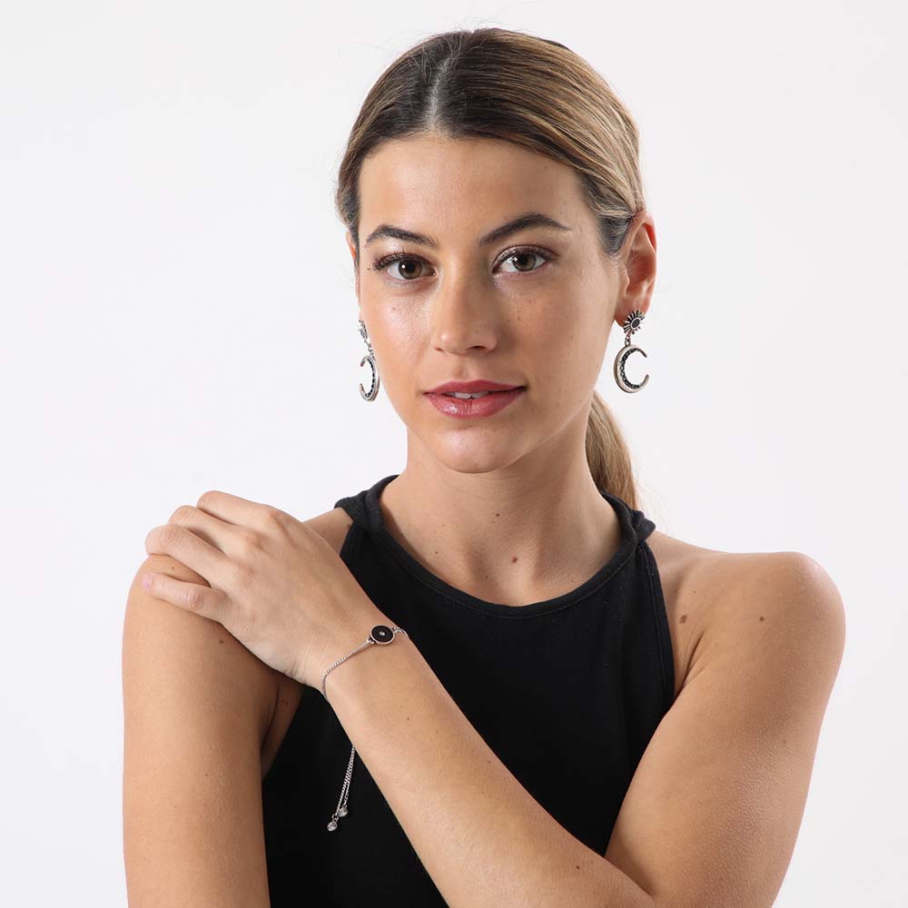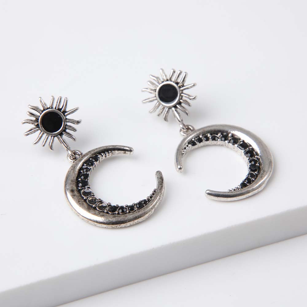 Aro Largo Humana Cuasia de color negro perteneciente a la colección Planetary Alignment. Aros colgantes con base en forma de sol plateado con centro negro, de la que se desprende una luna plateada con cristales de fantasía de color negro.