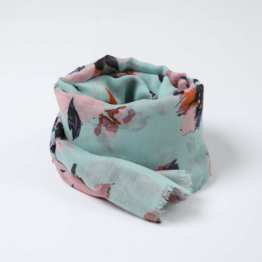 Pañuelo estampado iD Ceci de color verde. Su diseño es un estampado verde con flores rosadas con detalles en naranjo y tallos azules.
