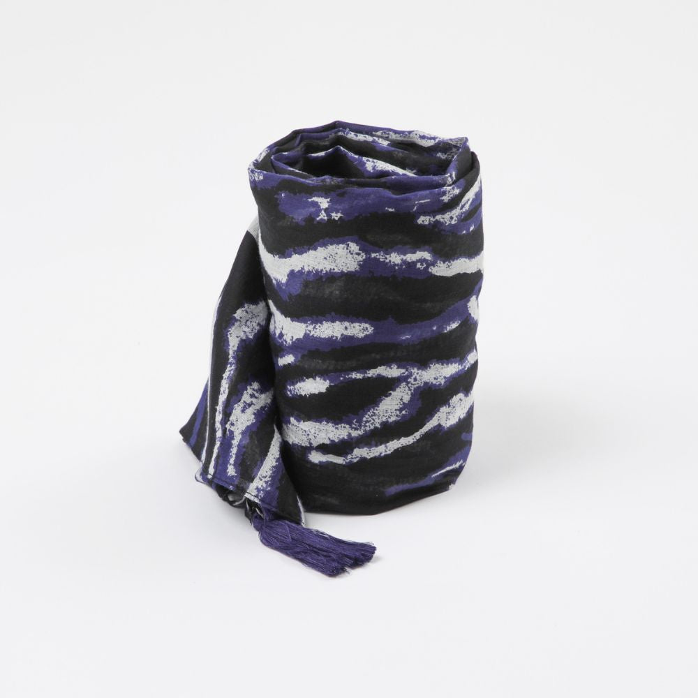 Pañuelo de algodón estampado con motivo de rayas animal blancas con sombras azules sobre fondo negro con un franjas blancas en los extremos del pañuelo que dicen humana con terminaciones de borlas.