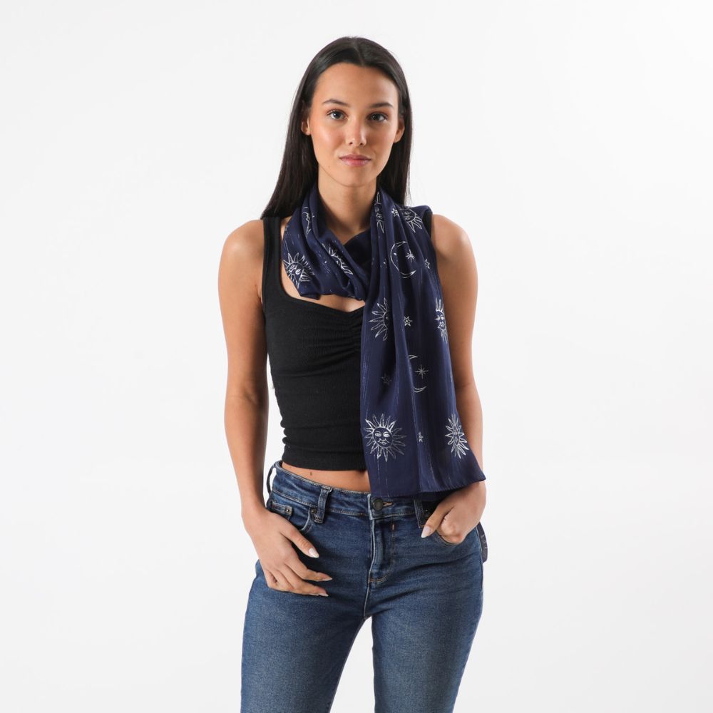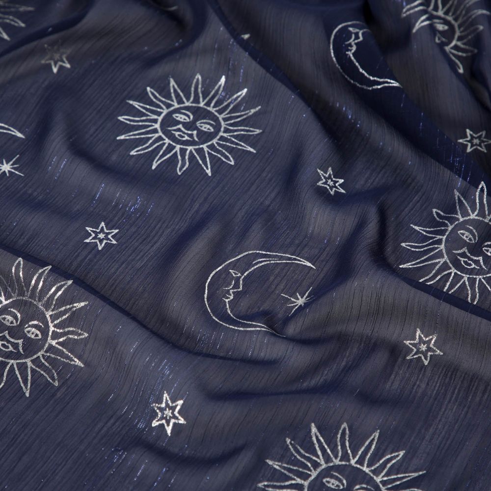 Pañuelo azul liso con hilos metalizados azules y con un estampado con motivo de lunas y soles plateados.
