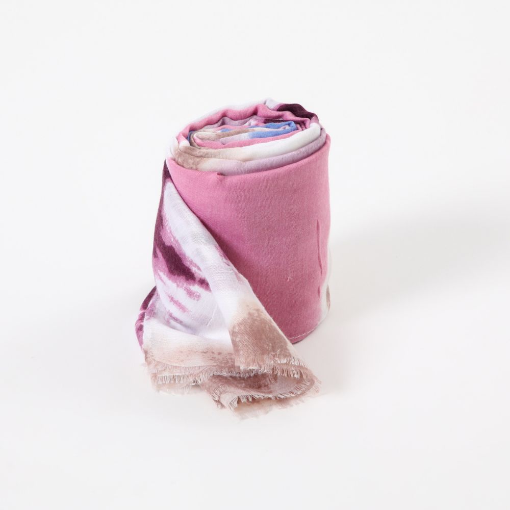 Pañuelo rosado estampado con motivo de rayas grandes en tonos morados, rosados, celestes y desteñidos, con terminaciones desflecadas en los extremos cortos del pañuelo