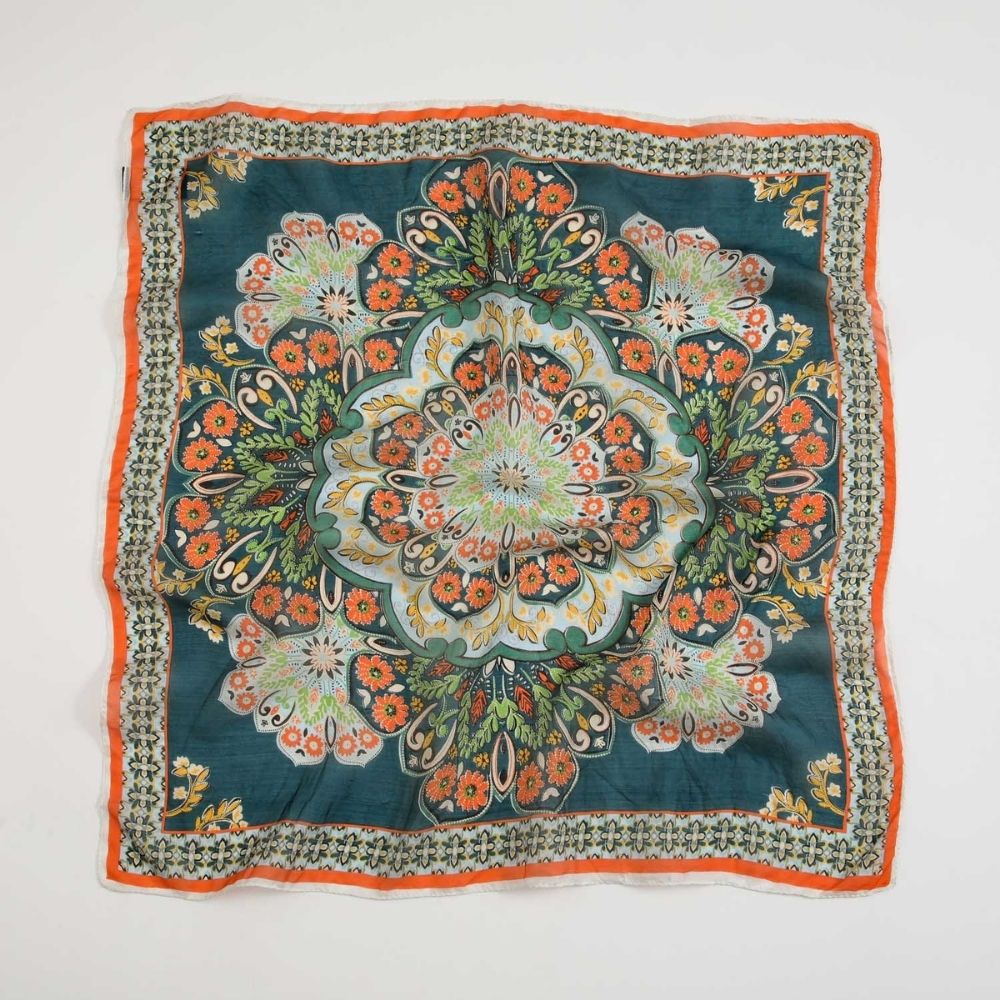 Bandana de seda verde oscuro con estampado mandala floral, marco en contraste blanco y naranjo. Terminación dobladillo.