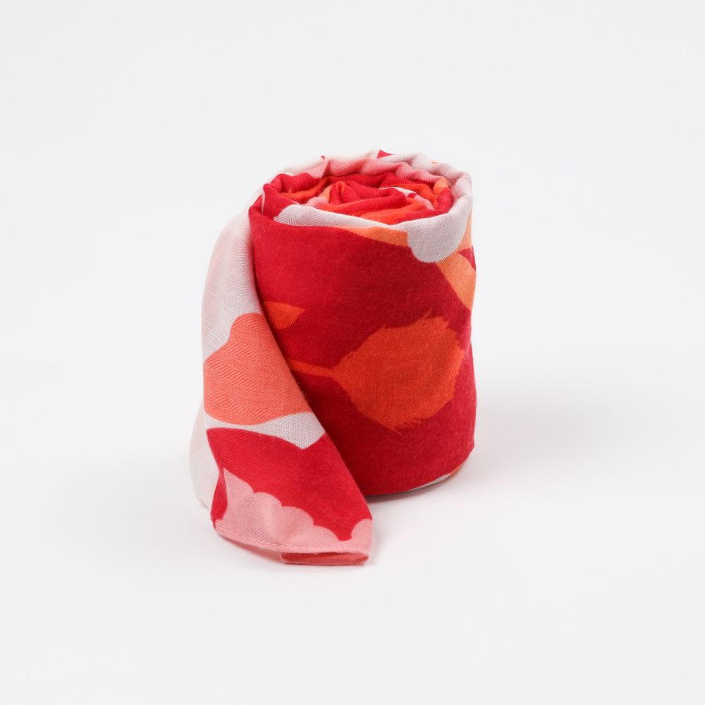 Pañuelo estampado con motivos florales de colores sobre un fondo de color rojo con terminaciones de costura lisa.