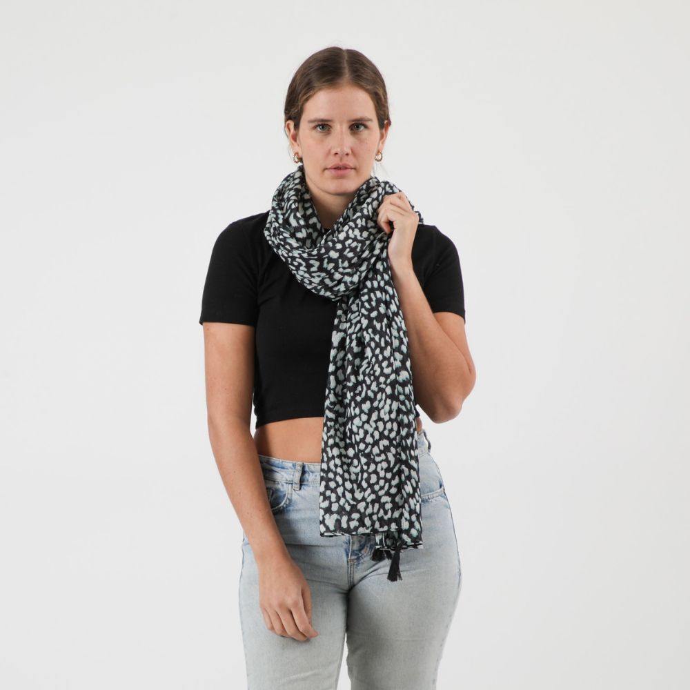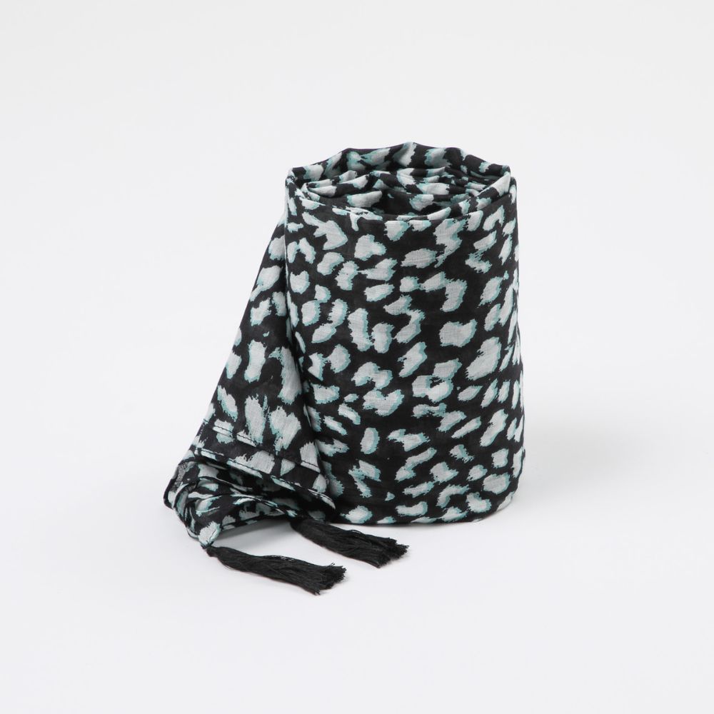 Pañuelo de algodón estampado con motivo de manchas de leopardo blancas con sombras celestes sobre un fondo negro con terminaciones de borlas negras en las cuatro esquinas del pañuelo.