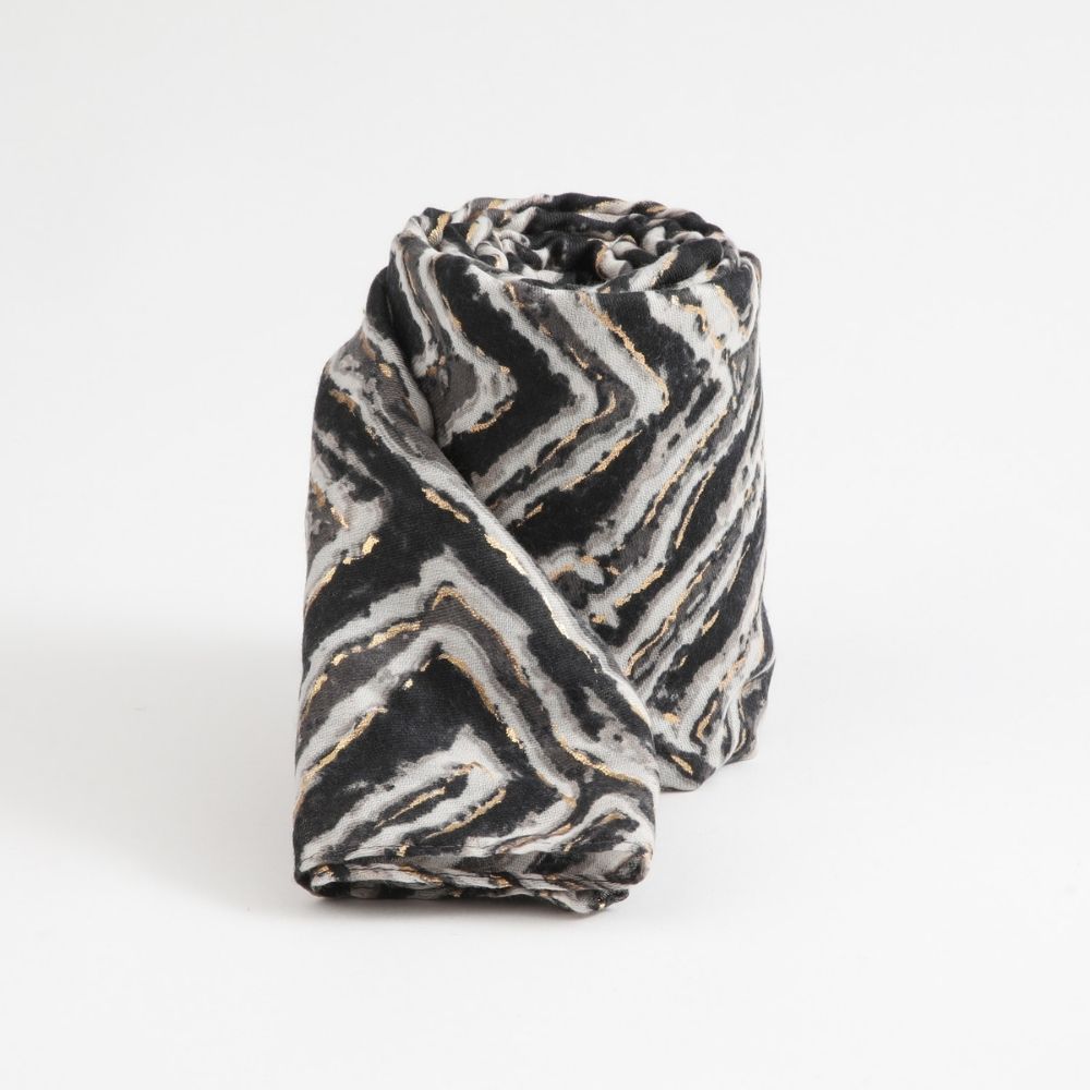 Pañuelo estampado motivo geométrico en tonos negros y dorado. Terminación dobladillo.