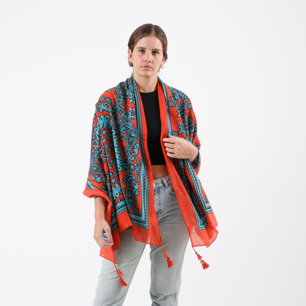 Pañuelo naranja con estampado tipo mandala celestre con borde negro y terminación de borlas en los extremos del pañuelo.