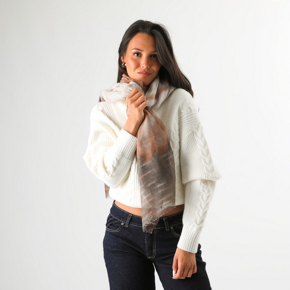 Pañuelo en tela liviana y color café con efecto degradado, de terminación desflecada en los bordes. Incluye textura visual suave, caída natural y logo H aplicado en parche textil. De uso versátil para llevar al cuello, sobre los hombros o como complemento en looks diarios. Un diseño elegante y atemporal.