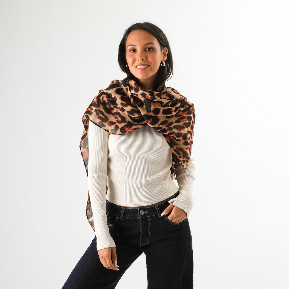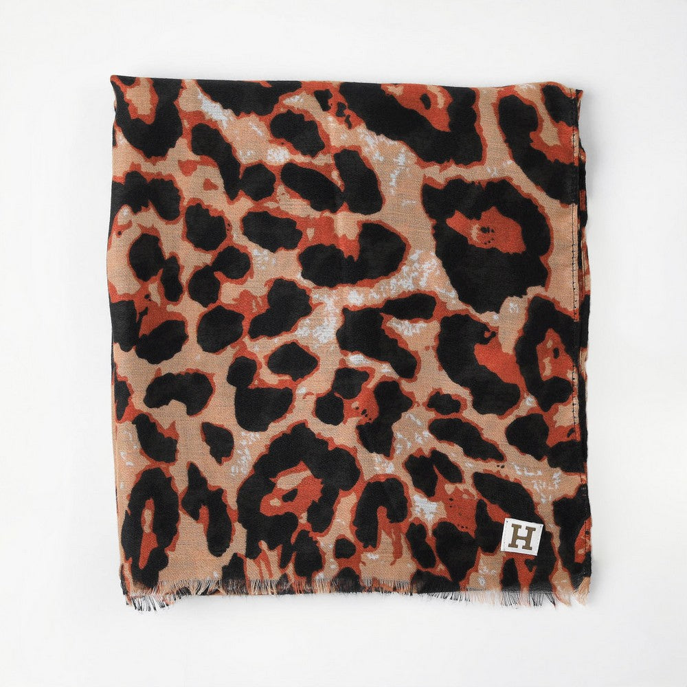 Pañuelo en tela liviana y color beige con estampado animal print en tonos negro y terracota, con terminación desflecada en los bordes. Incluye textura suave, caída flexible y logo H aplicado en parche textil. De uso versátil para llevar al cuello, como accesorio en el pelo o para complementar carteras. Un diseño audaz y moderno.