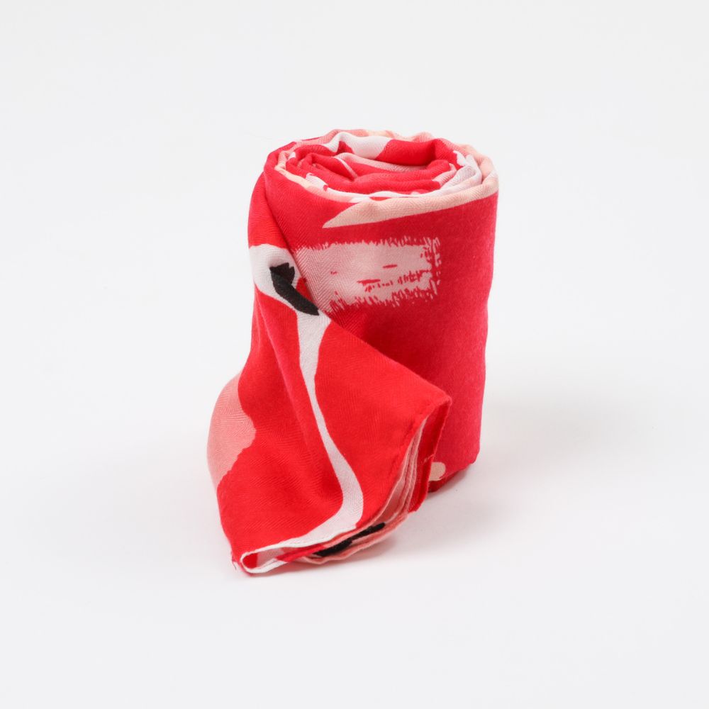 Pañuelo estampado con motivos florales rojos sobre un fondo blanco con terminaciones de costura lisa por todos los extremos del pañuelo.