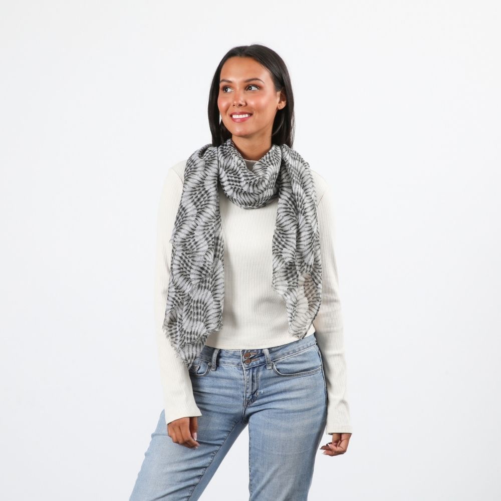 Pañuelo Gris Con Estampado De Columnas Curvas Con Líneas Negras Y Terminación Deflecada.
