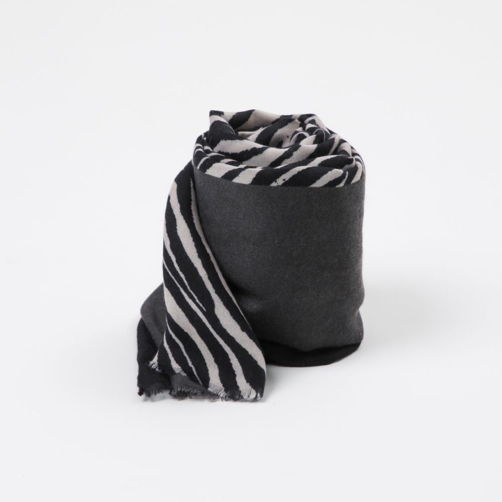 Pañuelo estampado con motivo de cebra y bordes grises con terminacion desflecada.