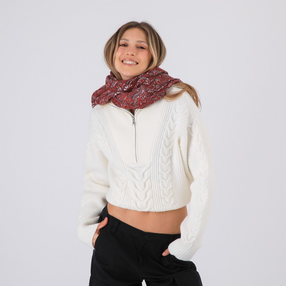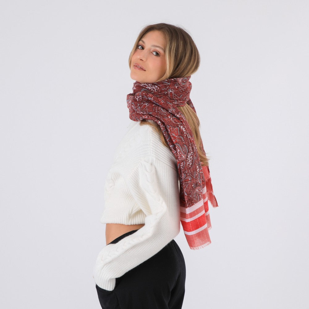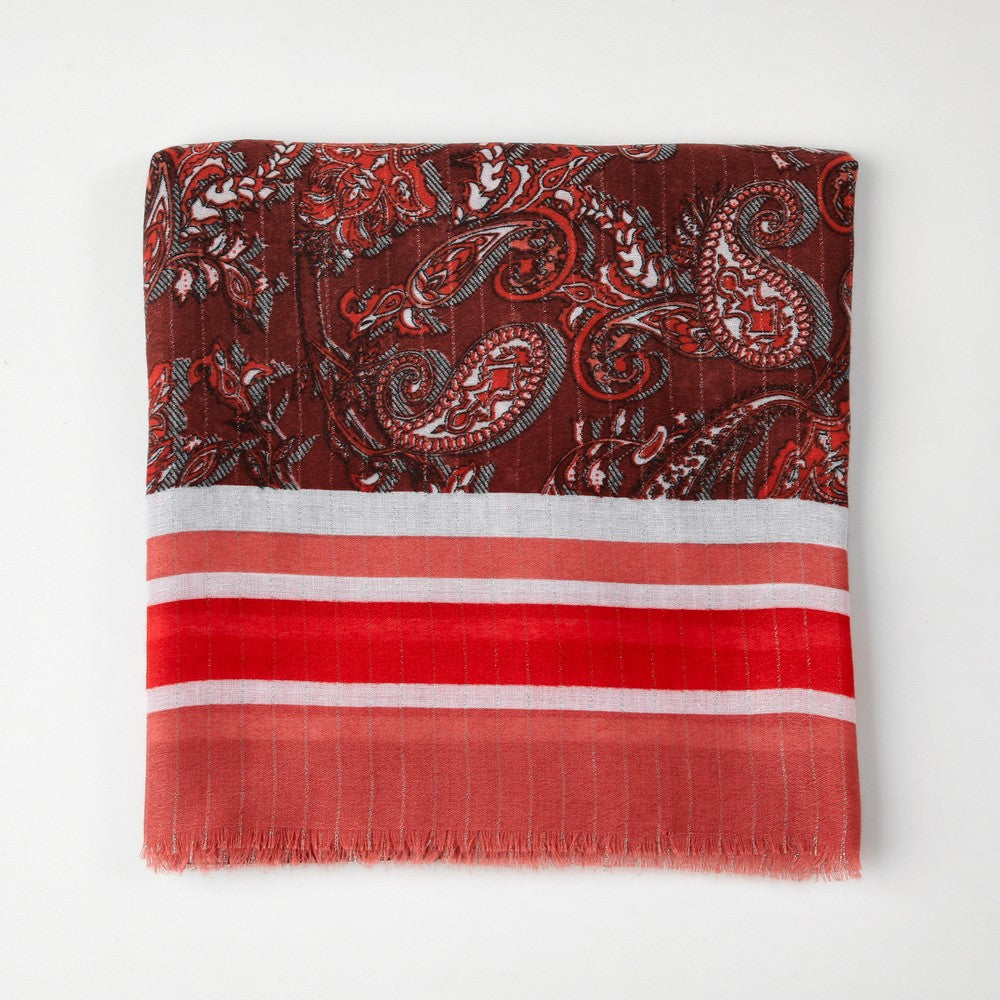 Pañuelo estampado con diseño tipo paisley y detalles florales en tonos burdeos, rojo y acentos claros. Incluye una guarda con franjas contrastantes y sutiles hilos brillantes que aportan textura y un toque elegante. Liviano y versátil, ideal para complementar distintos looks.