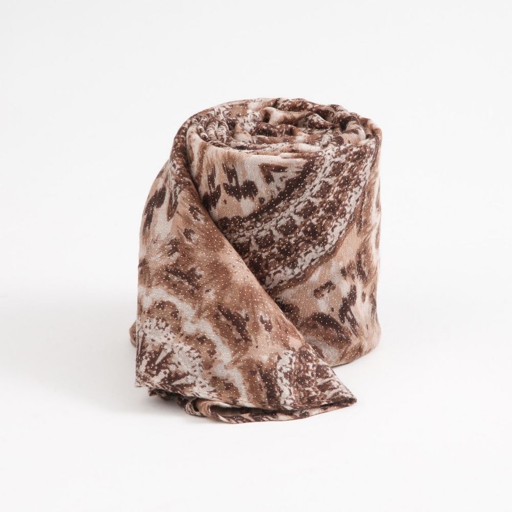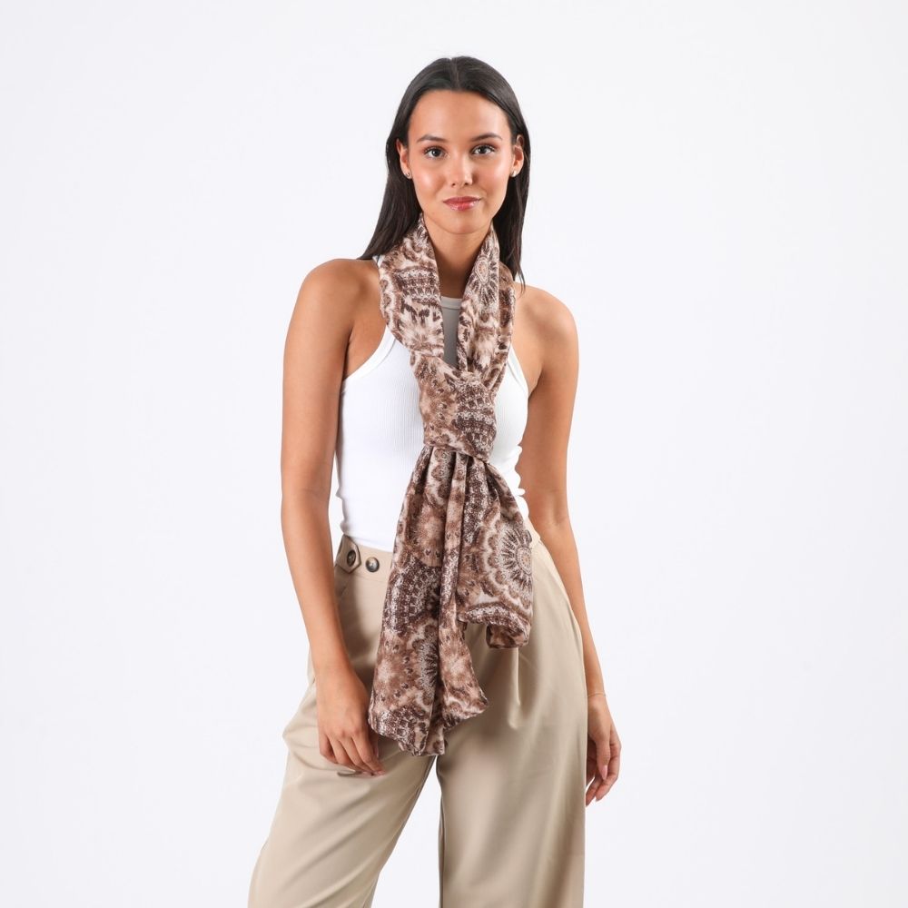 Pañuelo estampado mandala en tonos beige, café y dorados, textura suave. Terminación dobladillo.