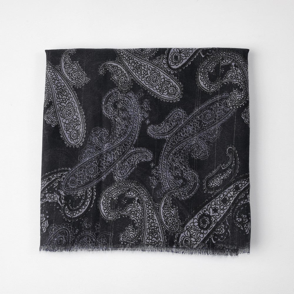 Pañuelo estampado con diseño tipo paisley en una combinación de azules profundos y celeste suave y detalles de hilo plateado, que genera un contraste elegante y atemporal. Tiene textura liviana y de caída fluida, con bordes desflecados que aportan un acabado relajado. Un accesorio práctico y fácil de combinar, ideal para sumar un toque clásico y sofisticado a distintos looks.