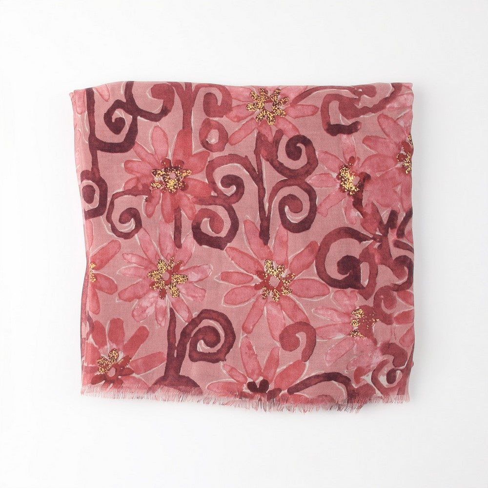 Pañuelo con estampado floral combinado con motivos orgánicos, en una paleta de tonos rosados, burdeos y acentos dorados que aportan un efecto decorativo sutil. Los bordes tienen terminación desflecada. Un accesorio versátil, ideal para usar al cuello, sobre los hombros o como complemento para distintos looks, aportando color y textura de forma fácil de combinar.