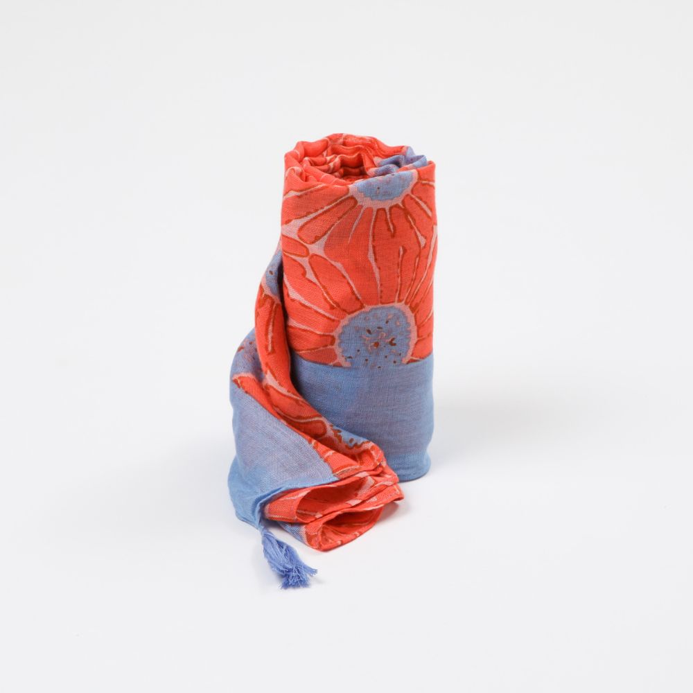 Pañuelo naranja y celeste con estampado de motivo floral y terminación de borlas en las esquinas.