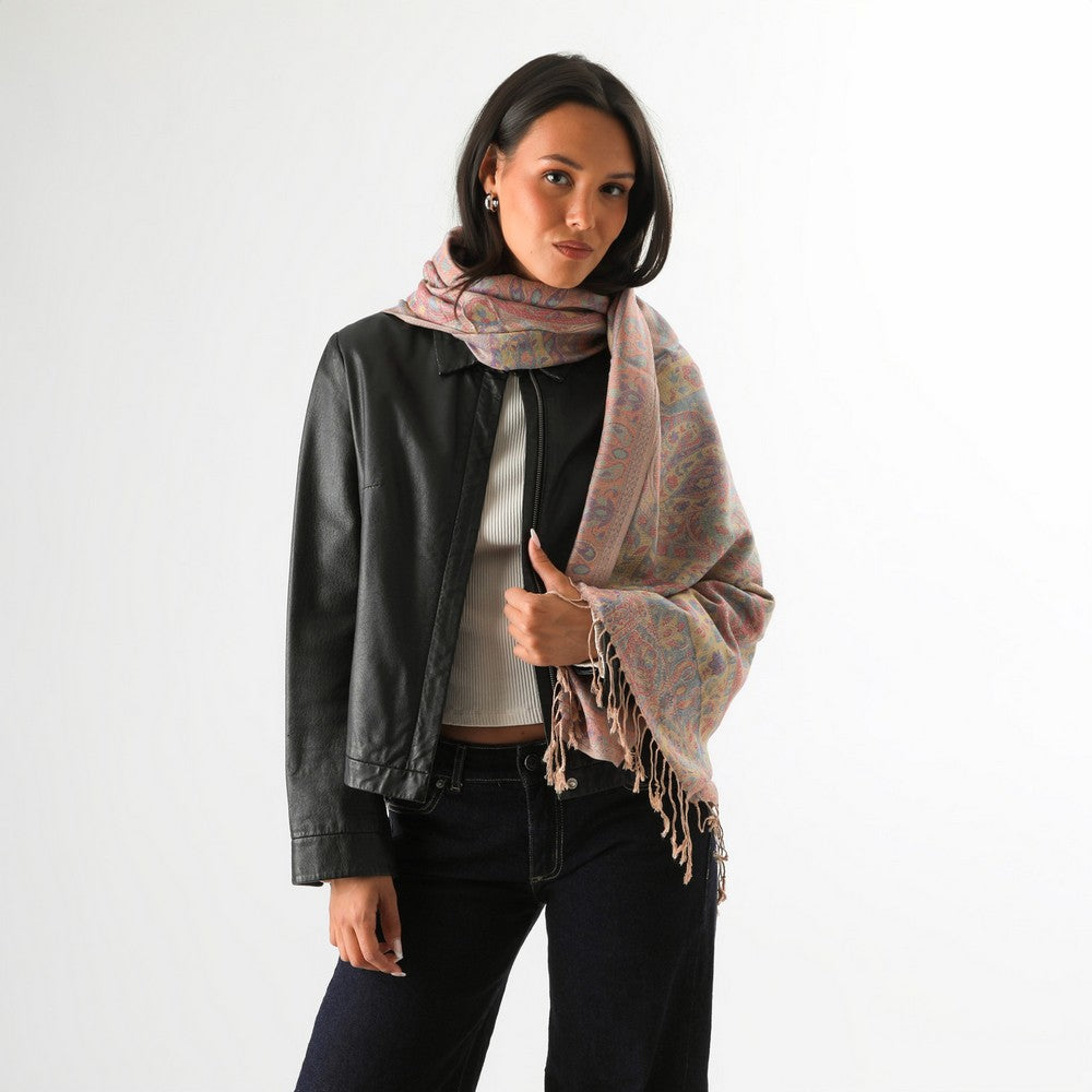 Pañuelo tejido con motivos en tonos suaves y terminaciones con flecos. Un accesorio liviano y fácil de combinar, ideal para el uso diario.