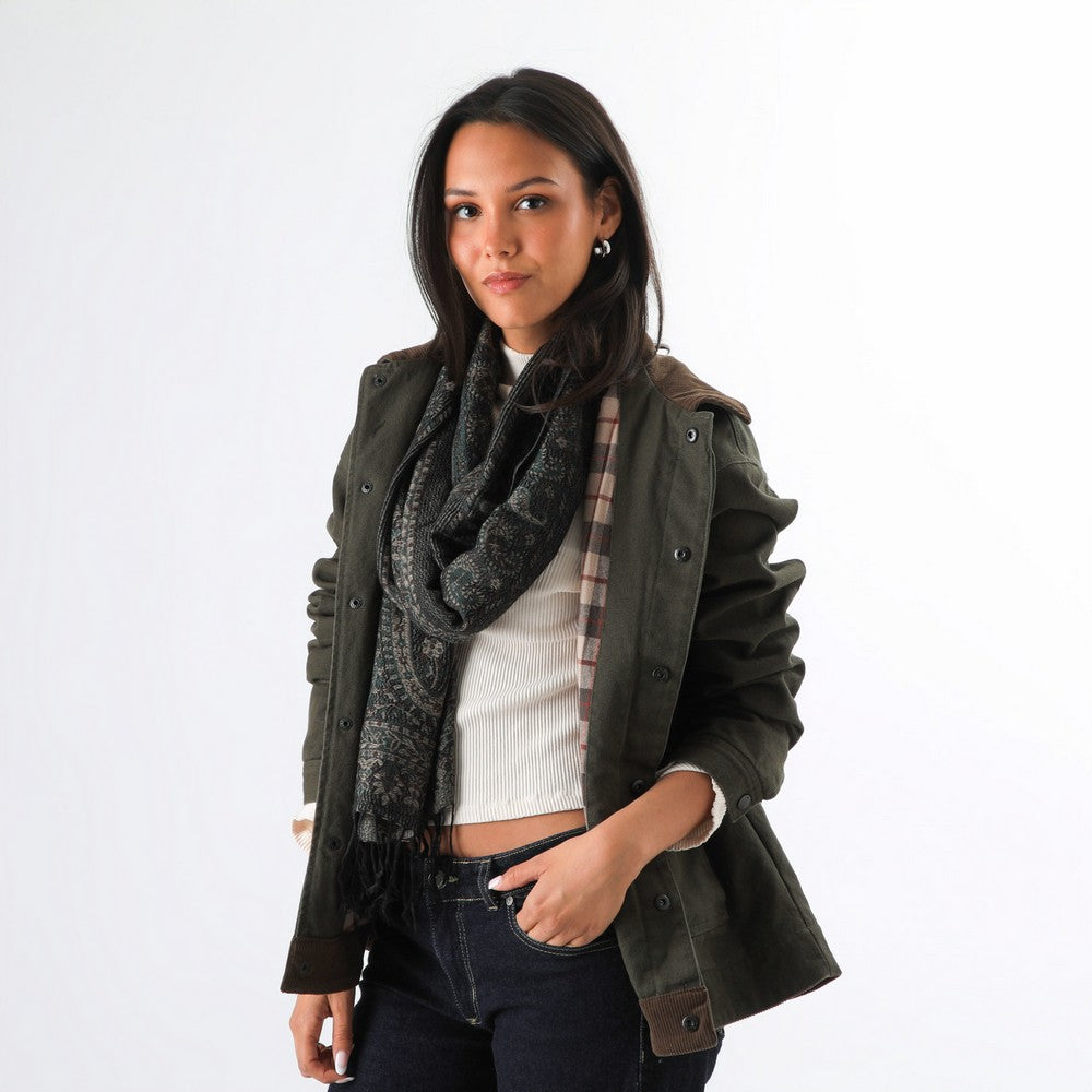 Pañuelo tejido con motivos en tonos oscuros y terminaciones con flecos. Un accesorio liviano y fácil de combinar, ideal para el uso diario.