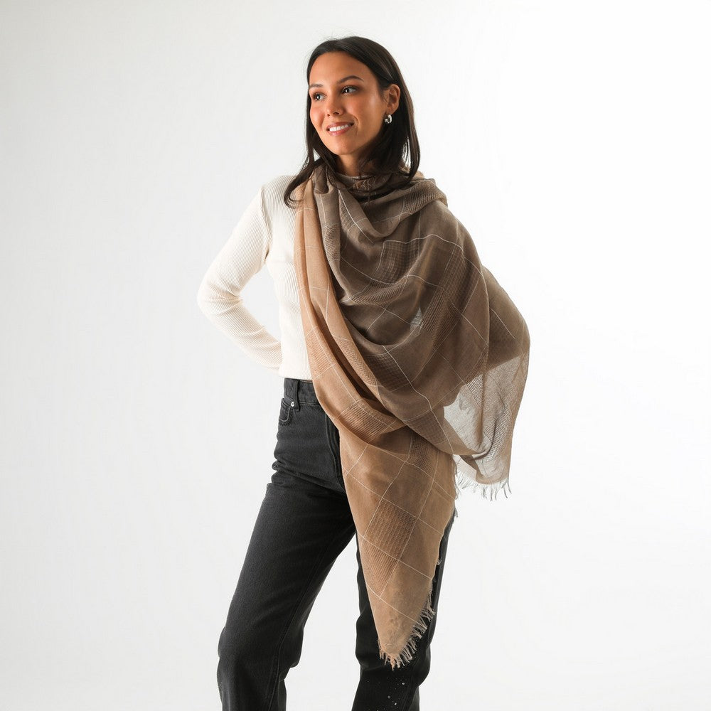 Pañuelo confeccionado en tela liviana de tono marrón. Presenta un diseño de cuadrícula formada por costuras visibles en hilo claro, combinando sectores lisos con áreas de textura más marcada dentro del mismo tejido. Un accesorio práctico y fácil de combinar.