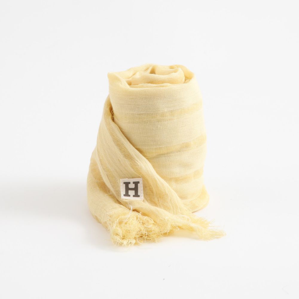 Pañuelo amarillo pastel con textura suave y terminación en bordes con flecos. Teñido a mano.