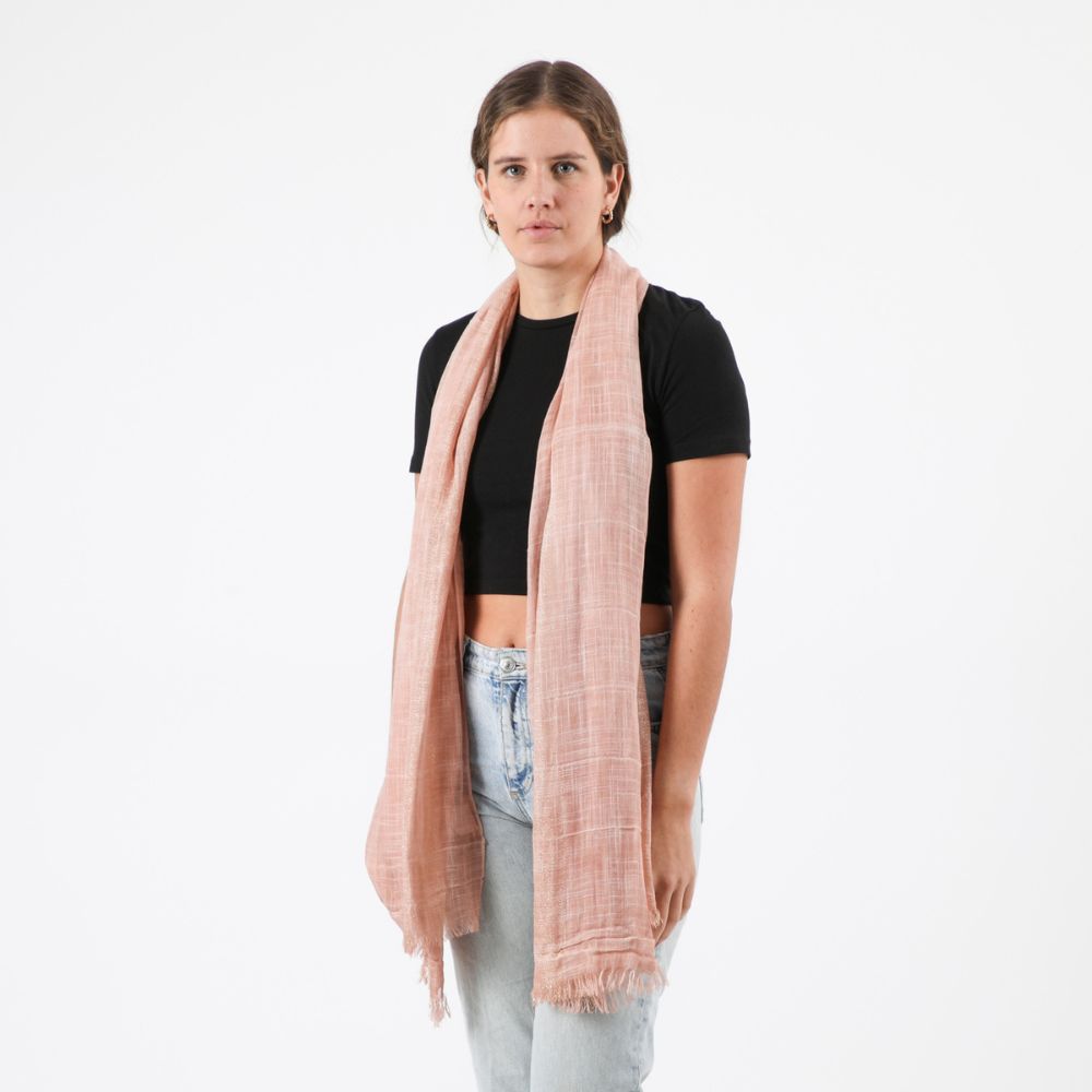 Pañuelo rosado liso con partes de hilos dorados metalizados intercalados a lo largo de todo el pañuelo y terminación de desflecado en los extremos más cortos del pañuelo.