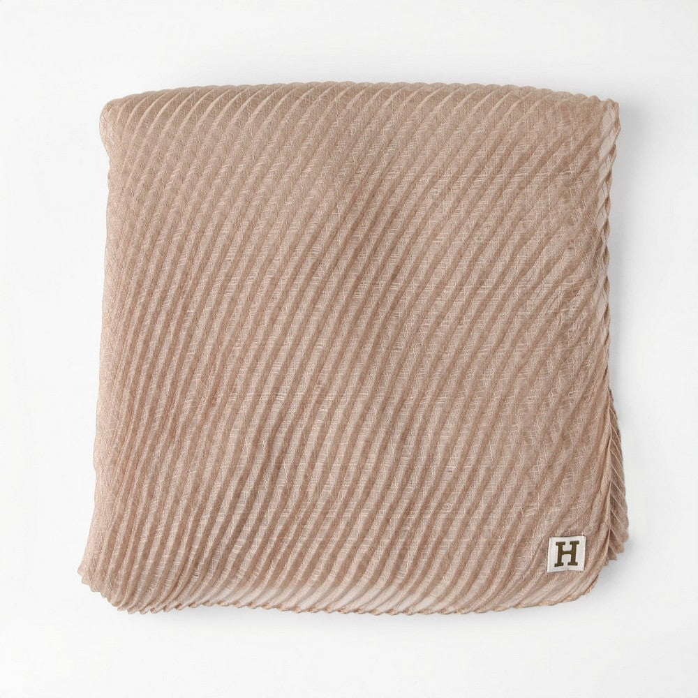 Pañuelo en tono beige con textura plisada. Presenta acabado parejo en los bordes y etiqueta textil con logo aplicado. Un accesorio versátil y fácil de combinar.